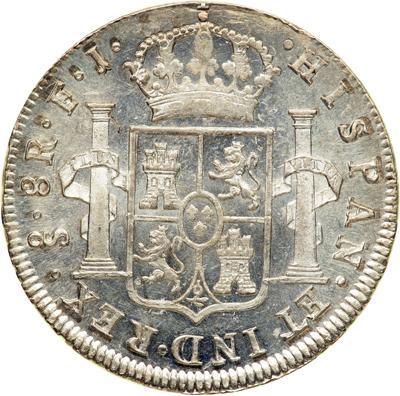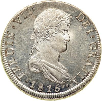 Chile. 8 Reales, 1815-So-F-J (Santiago). WR-8; KM-80. Ferdinand VII, 1808-1833. Bust of Ferdinand right. Reverse: Crowned arms between pillars. Slight weakness at wreath to an otherwise well struck up portrait; the reverse choice. Very lustrous devices and prooflike fields. With faint toning. NGC graded MS-62.