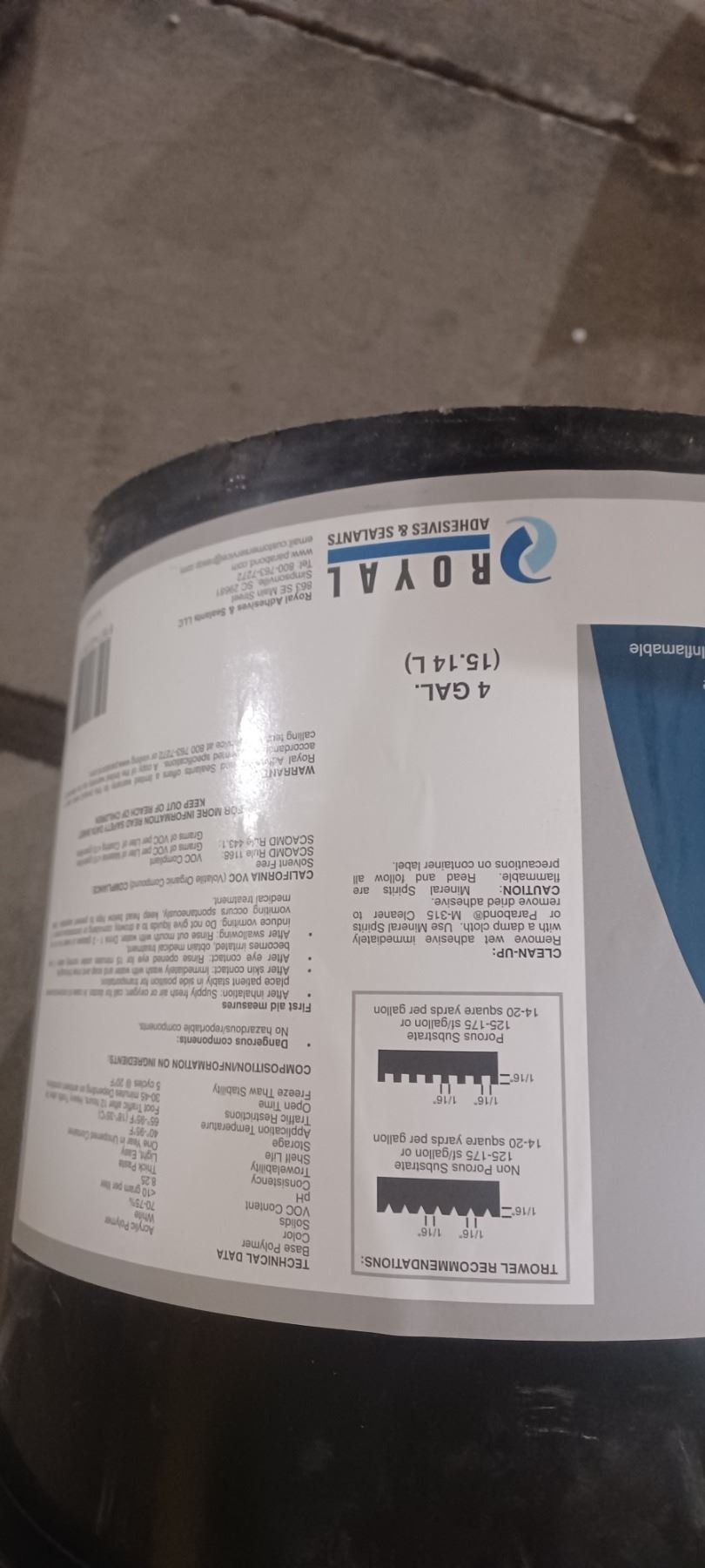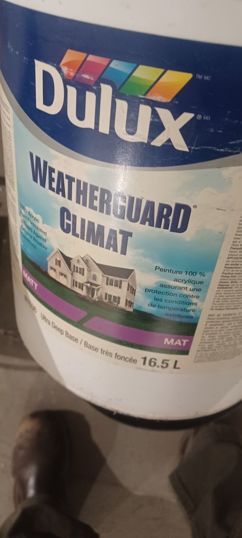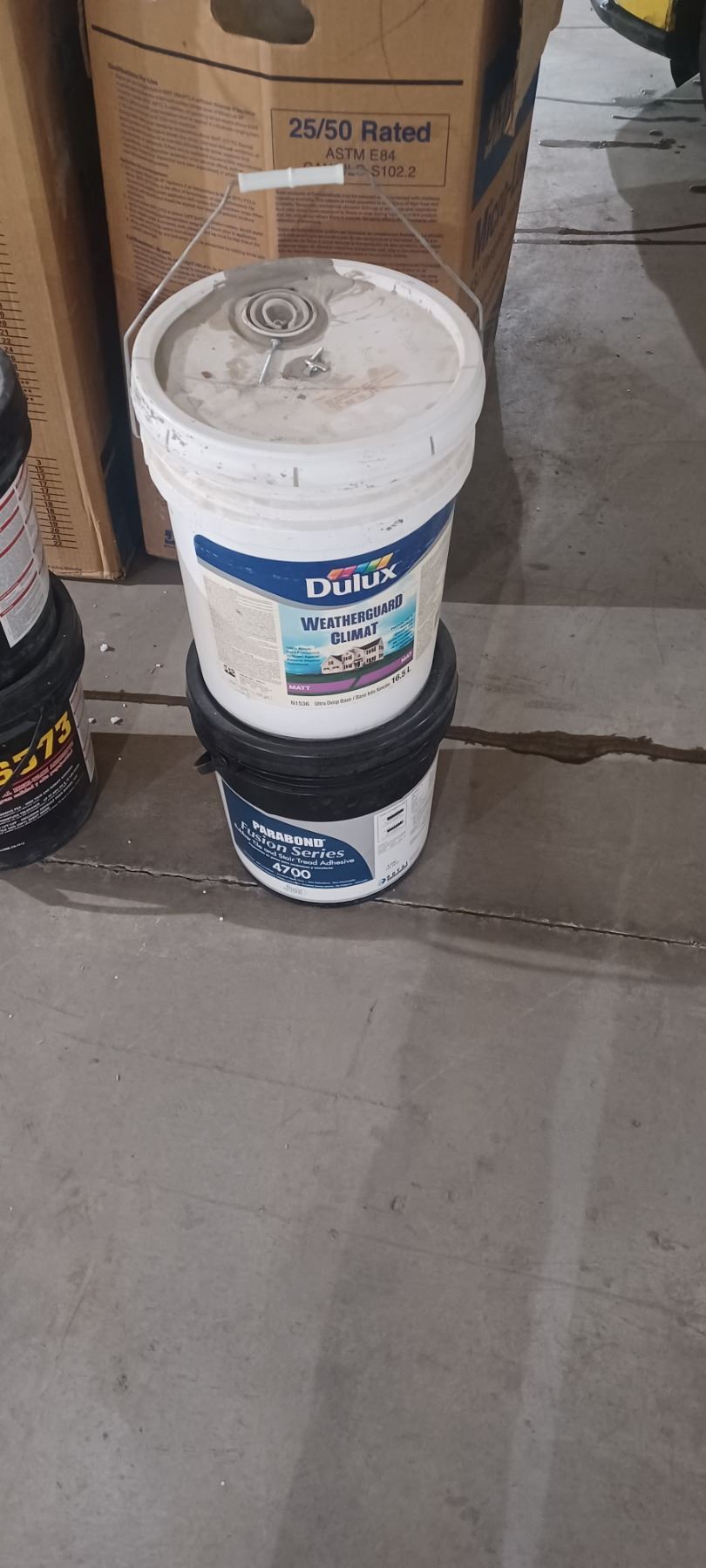 0NE 16.5 LITRE PAIL OF DULUX WEATHER GAURD PAINT AND 4 GAL PAIL OF RUBBER TLE AND STAIR TREAD GLUE