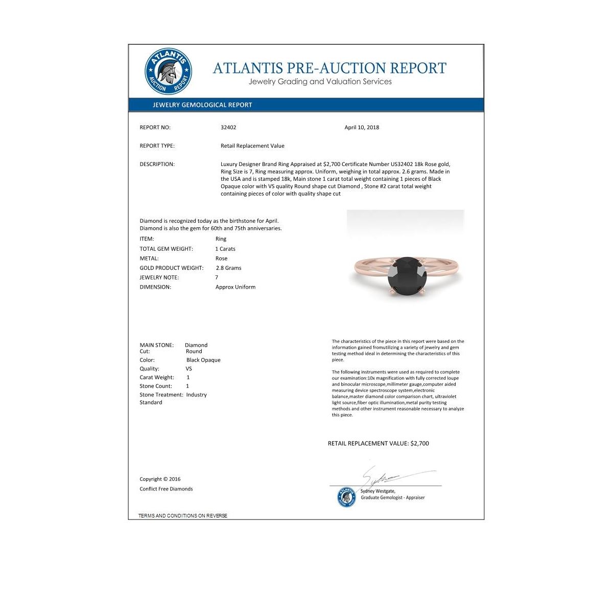 REF-44T5M -32402 ---- 1.0 CTW Black Diamond Engagement Designer Ring 18K Rose Gold ---- Luxury Designer Brand Ring Appraised at $2,700 Certificate Number US32402 18k Rose gold, Ring Size is 7, Ring measuring approx. Uniform, weighing in total approx. 2.6 grams. Made in the USA and is stamped 18k, Main stone 1 carat total weight containing 1 pieces of Black Opaque color with VS quality Round shape cut Diamond , Stone #2 carat total weight containing pieces of color with quality shape cut