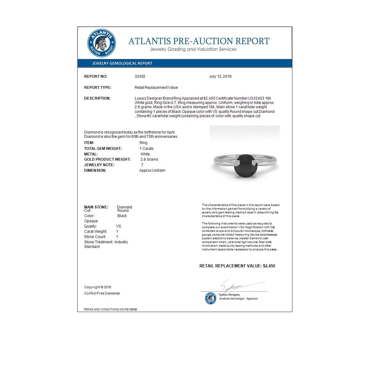 REF-44Y5K -32403 ---- 1.0 CTW Black Diamond Engagement Designer Ring 18K White Gold ---- Luxury Designer Brand Ring Appraised at $2,450 Certificate Number US32403 18k White gold, Ring Size is 7, Ring measuring approx. Uniform, weighing in total approx. 2.6 grams. Made in the USA and is stamped 18k, Main stone 1 carat total weight containing 1 pieces of Black Opaque color with VS quality Round shape cut Diamond , Stone #2 carat total weight containing pieces of color with quality shape cut