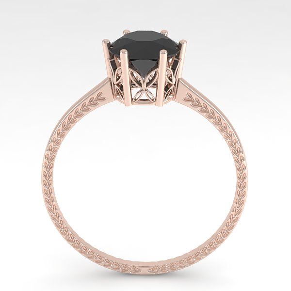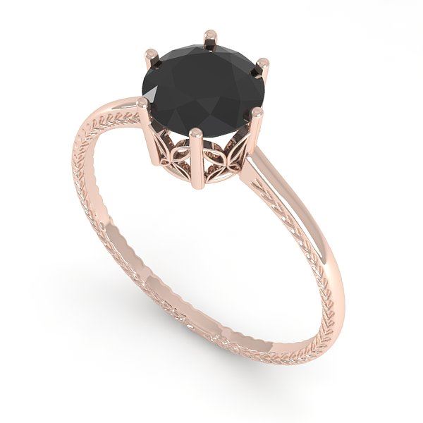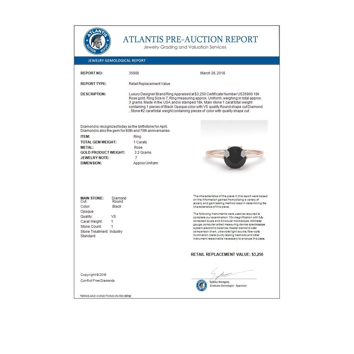 REF-53M6H -35900 ---- 1.0 CTW Black Diamond Solitaire Engagement Ring 18K Rose Gold ---- Luxury Designer Brand Ring Appraised at $3,250 Certificate Number US35900 18k Rose gold, Ring Size is 7, Ring measuring approx. Uniform, weighing in total approx. 3 grams. Made in the USA and is stamped 18k, Main stone 1 carat total weight containing 1 pieces of Black Opaque color with VS quality Round shape cut Diamond , Stone #2 carat total weight containing pieces of color with quality shape cut