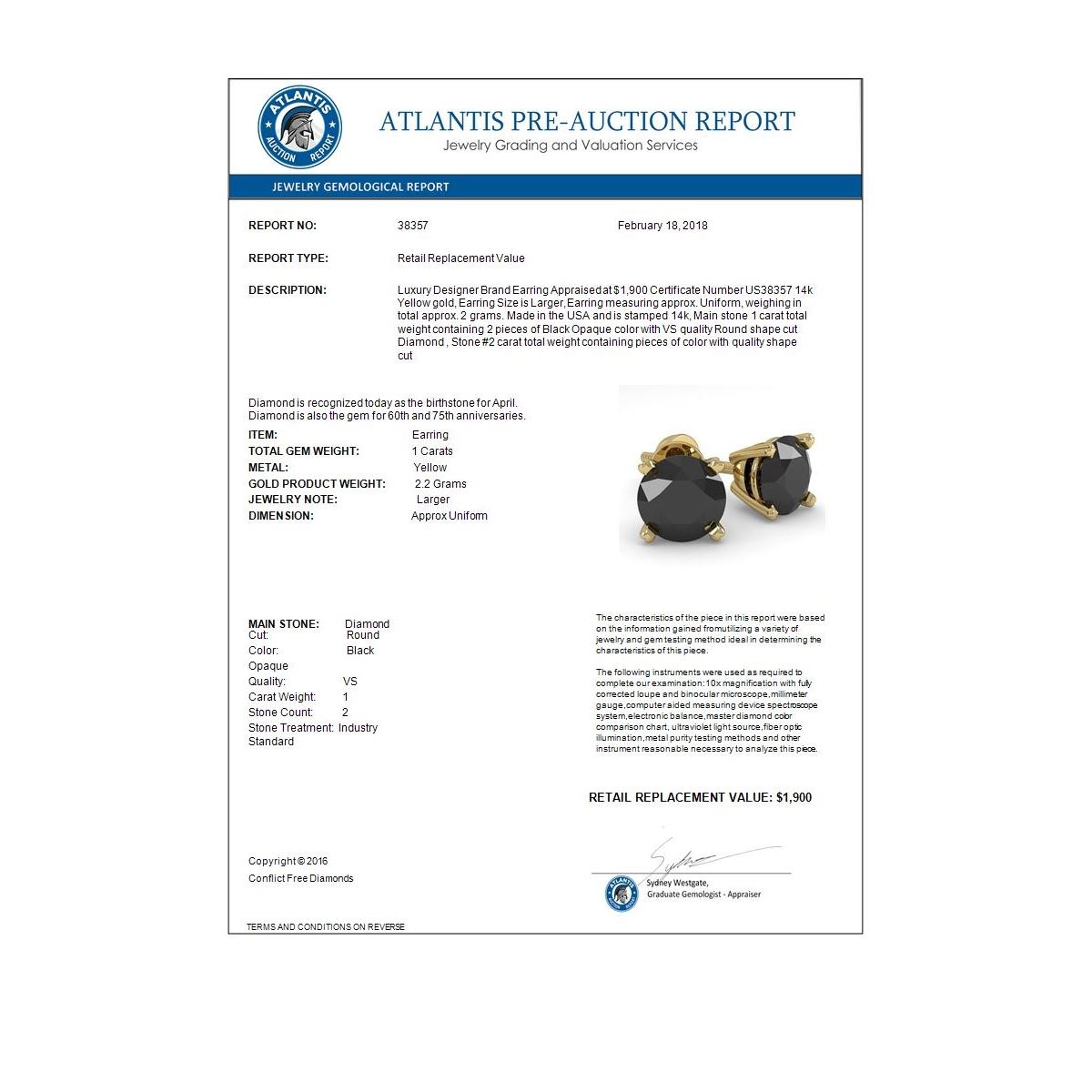REF-28W5F -38357 ---- 1.0 CTW Black Diamond Stud Designer Earrings 14K Yellow Gold ---- Luxury Designer Brand Earring Appraised at $1,900 Certificate Number US38357 14k Yellow gold, Earring Size is Larger, Earring measuring approx. Uniform, weighing in total approx. 2 grams. Made in the USA and is stamped 14k, Main stone 1 carat total weight containing 2 pieces of Black Opaque color with VS quality Round shape cut Diamond , Stone #2 carat total weight containing pieces of color with quality shape cut