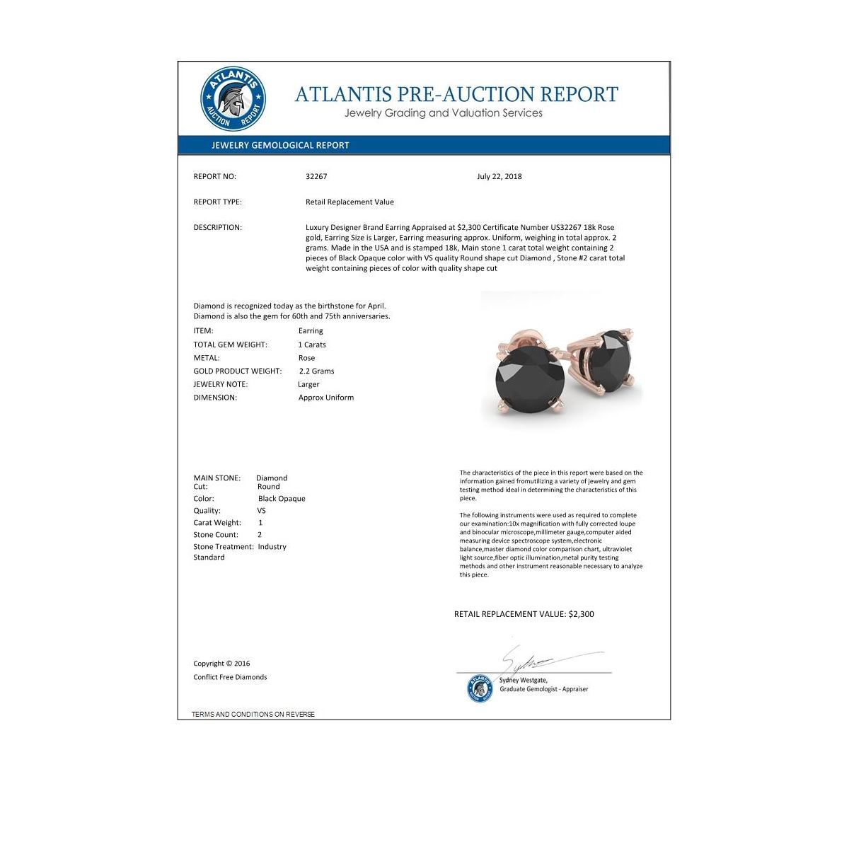 REF-41H6A -32267 ---- 1.0 CTW Black Diamond Stud Designer Earrings 18K Rose Gold ---- Luxury Designer Brand Earring Appraised at $2,300 Certificate Number US32267 18k Rose gold, Earring Size is Larger, Earring measuring approx. Uniform, weighing in total approx. 2 grams. Made in the USA and is stamped 18k, Main stone 1 carat total weight containing 2 pieces of Black Opaque color with VS quality Round shape cut Diamond , Stone #2 carat total weight containing pieces of color with quality shape cut