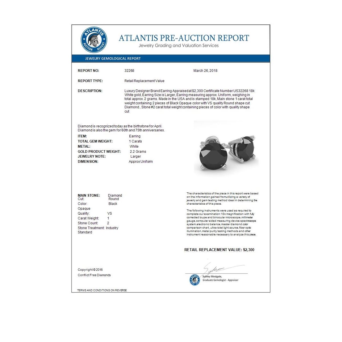 REF-41W6F -32268 ---- 1.0 CTW Black Diamond Stud Designer Earrings 18K White Gold ---- Luxury Designer Brand Earring Appraised at $2,300 Certificate Number US32268 18k White gold, Earring Size is Larger, Earring measuring approx. Uniform, weighing in total approx. 2 grams. Made in the USA and is stamped 18k, Main stone 1 carat total weight containing 2 pieces of Black Opaque color with VS quality Round shape cut Diamond , Stone #2 carat total weight containing pieces of color with quality shape cut