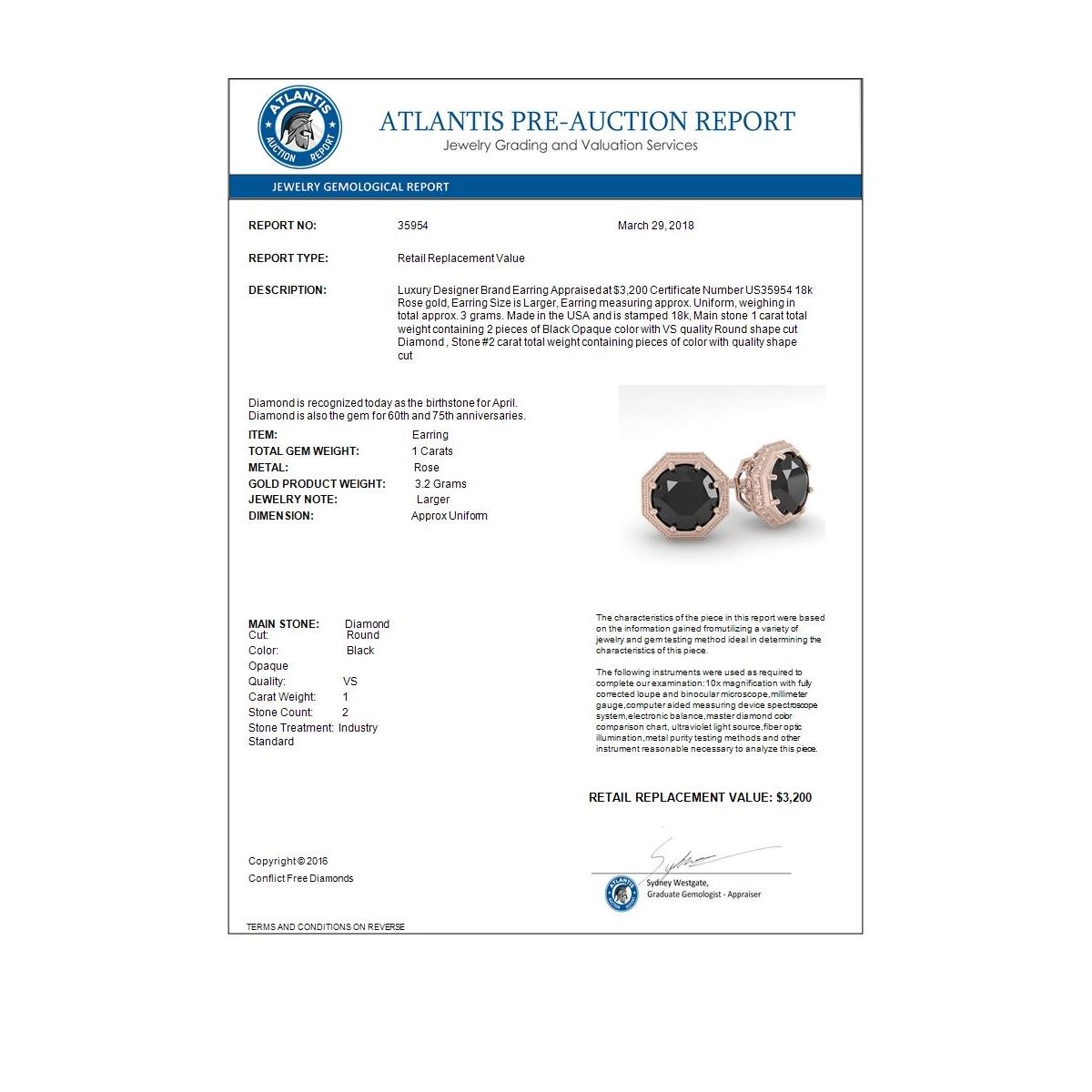 REF-52T5M -35954 ---- 1.0 CTW Black Diamond Stud Solitaire Earrings 18K Rose Gold ---- Luxury Designer Brand Earring Appraised at $3,200 Certificate Number US35954 18k Rose gold, Earring Size is Larger, Earring measuring approx. Uniform, weighing in total approx. 3 grams. Made in the USA and is stamped 18k, Main stone 1 carat total weight containing 2 pieces of Black Opaque color with VS quality Round shape cut Diamond , Stone #2 carat total weight containing pieces of color with quality shape cut