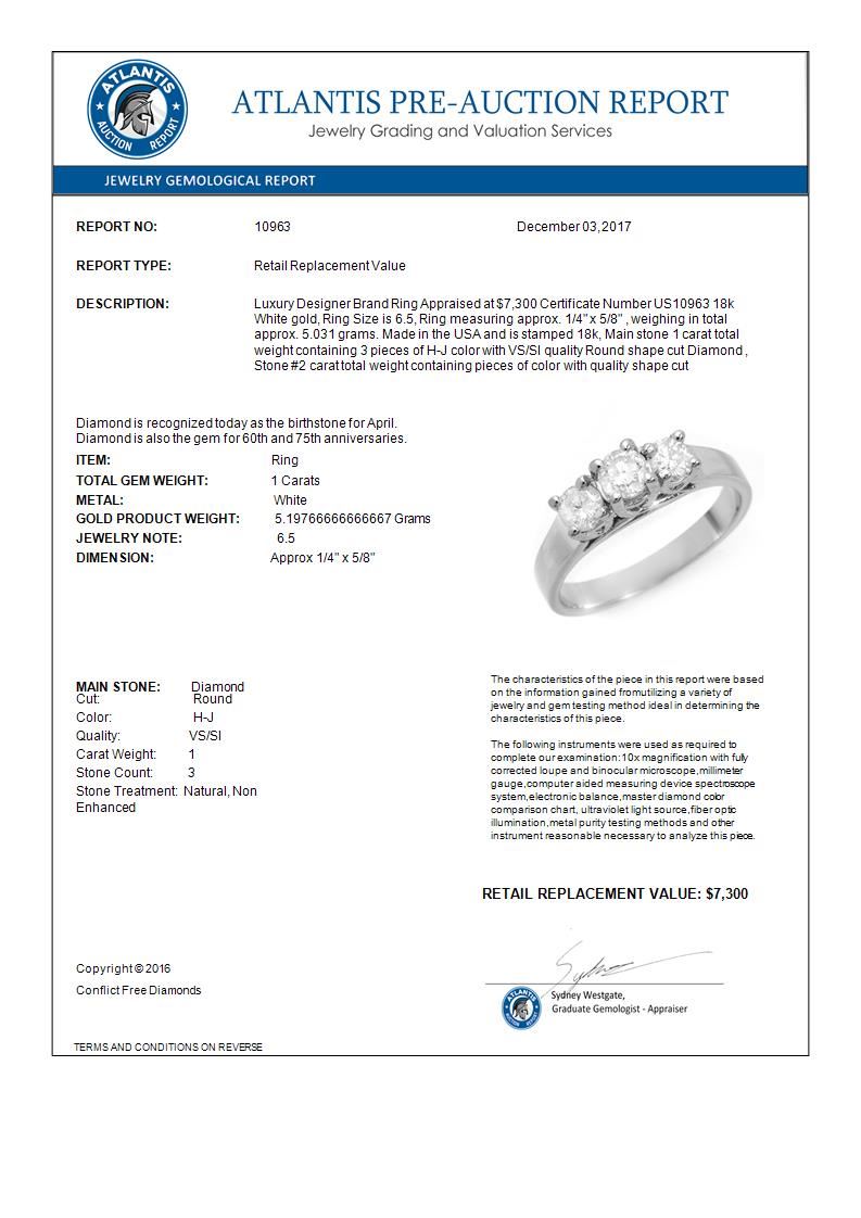 REF-147W3F -10963 ---- 1.0 CTW Certified VS/SI Diamond 3 Stone Ring 18K White Gold ---- Luxury Designer Brand Ring Appraised at $7,300 Certificate Number US10963  18k White gold,  Ring Size is 6.5, Ring measuring approx. 1/4" x  5/8" , weighing in total approx. 5.031 grams. Made in the USA and is stamped 18k, Main stone 1 carat total weight containing 3 pieces of H-J color with VS/SI quality Round shape cut Diamond , Stone #2  carat total weight containing  pieces of  color with quality  shape cut