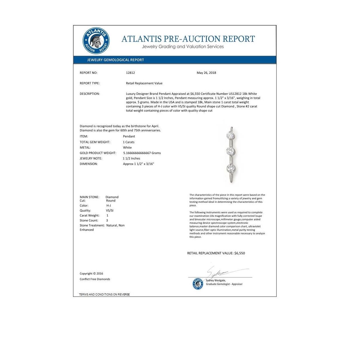 REF-132A2X -12812 ---- 1.0 CTW Certified VS/SI Diamond Pendant 18K White Gold ---- Luxury Designer Brand Pendant Appraised at $6,550 Certificate Number US12812 18k White gold, Pendant Size is 1 1/2 Inches, Pendant measuring approx. 1 1/2" x 3/16", weighing in total approx. 5 grams. Made in the USA and is stamped 18k, Main stone 1 carat total weight containing 3 pieces of H-J color with VS/SI quality Round shape cut Diamond , Stone #2 carat total weight containing pieces of color with quality shape cut