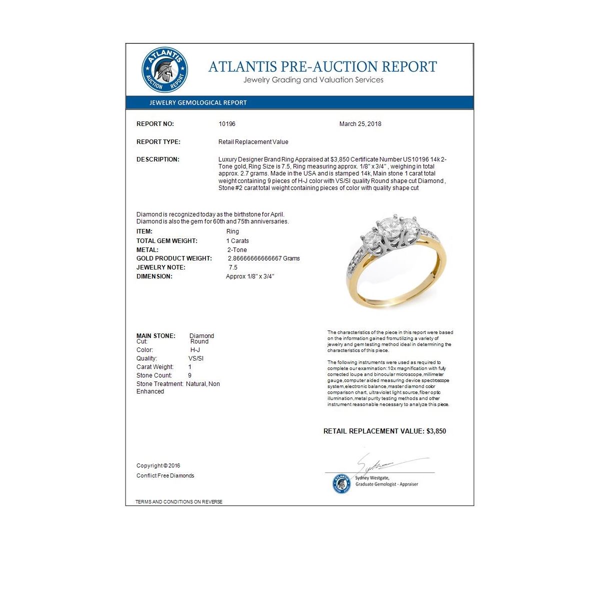 REF-87K5W -10196 ---- 1.0 CTW Certified VS/SI Diamond Ring 14K 2-Tone Gold ---- Luxury Designer Brand Ring Appraised at $3,850 Certificate Number US10196 14k 2-Tone gold, Ring Size is 7.5, Ring measuring approx. 1/8" x 3/4" , weighing in total approx. 2.7 grams. Made in the USA and is stamped 14k, Main stone 1 carat total weight containing 9 pieces of H-J color with VS/SI quality Round shape cut Diamond , Stone #2 carat total weight containing pieces of color with quality shape cut