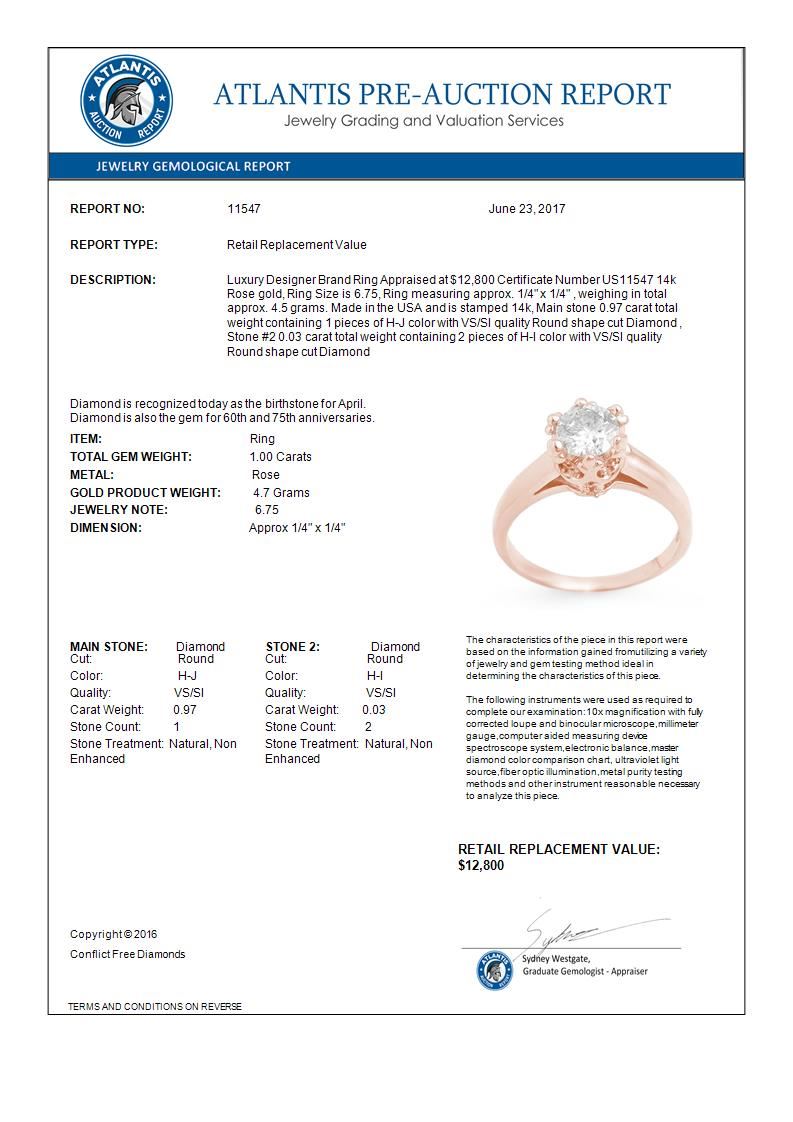 1.0 CTW Certified VS/SI Diamond Ring 14K Rose Gold ---- Luxury Designer Brand Ring Appraised Retail Price at $12,800 ---- SKU Number US11547 14k Rose gold Ring Size is 6.75, Ring measuring approx. 1/4" x 1/4" , weighing in total approx. 4.5 grams. Made in the USA and is stamped 14k, Main stone 0.97 carat total weight containing 1 pieces of H-J color with VS/SI quality Round shape cut Diamond , Stone #2 0.03 carat total weight containing 2 pieces of H-I color with VS/SI quality Round shape cut