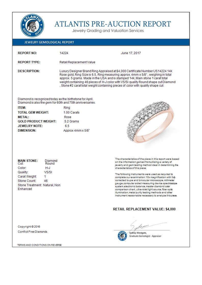 1.0 CTW Certified VS/SI Diamond Ring 14K Rose Gold ---- Luxury Designer Brand Ring Appraised Retail Price at $4,000 ---- SKU Number US14224 14k Rose gold Ring Size is 6.5, Ring measuring approx. 4mm x 5/8" , weighing in total approx. 5 grams. Made in the USA and is stamped 14k, Main stone 1 carat total weight containing 46 pieces of H-J color with VS/SI quality Round shape cut Diamond , Stone #2 carat total weight containing pieces of color with quality shape cut