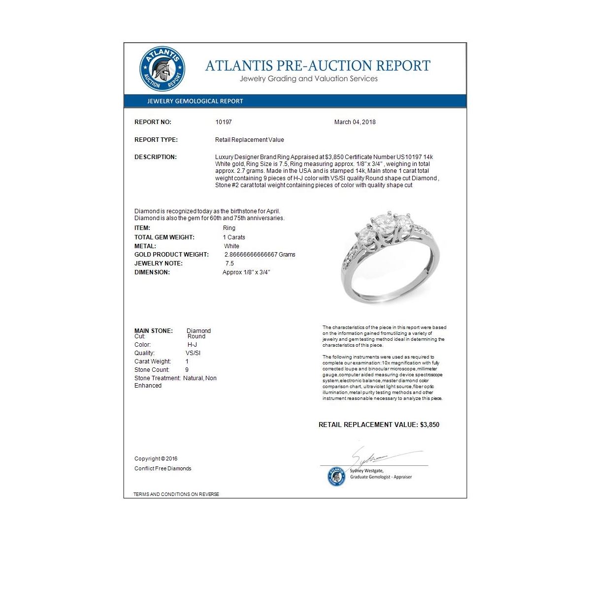 REF-87H5A -10197 ---- 1.0 CTW Certified VS/SI Diamond Ring 14K White Gold ---- Luxury Designer Brand Ring Appraised at $3,850 Certificate Number US10197 14k White gold, Ring Size is 7.5, Ring measuring approx. 1/8" x 3/4" , weighing in total approx. 2.7 grams. Made in the USA and is stamped 14k, Main stone 1 carat total weight containing 9 pieces of H-J color with VS/SI quality Round shape cut Diamond , Stone #2 carat total weight containing pieces of color with quality shape cut