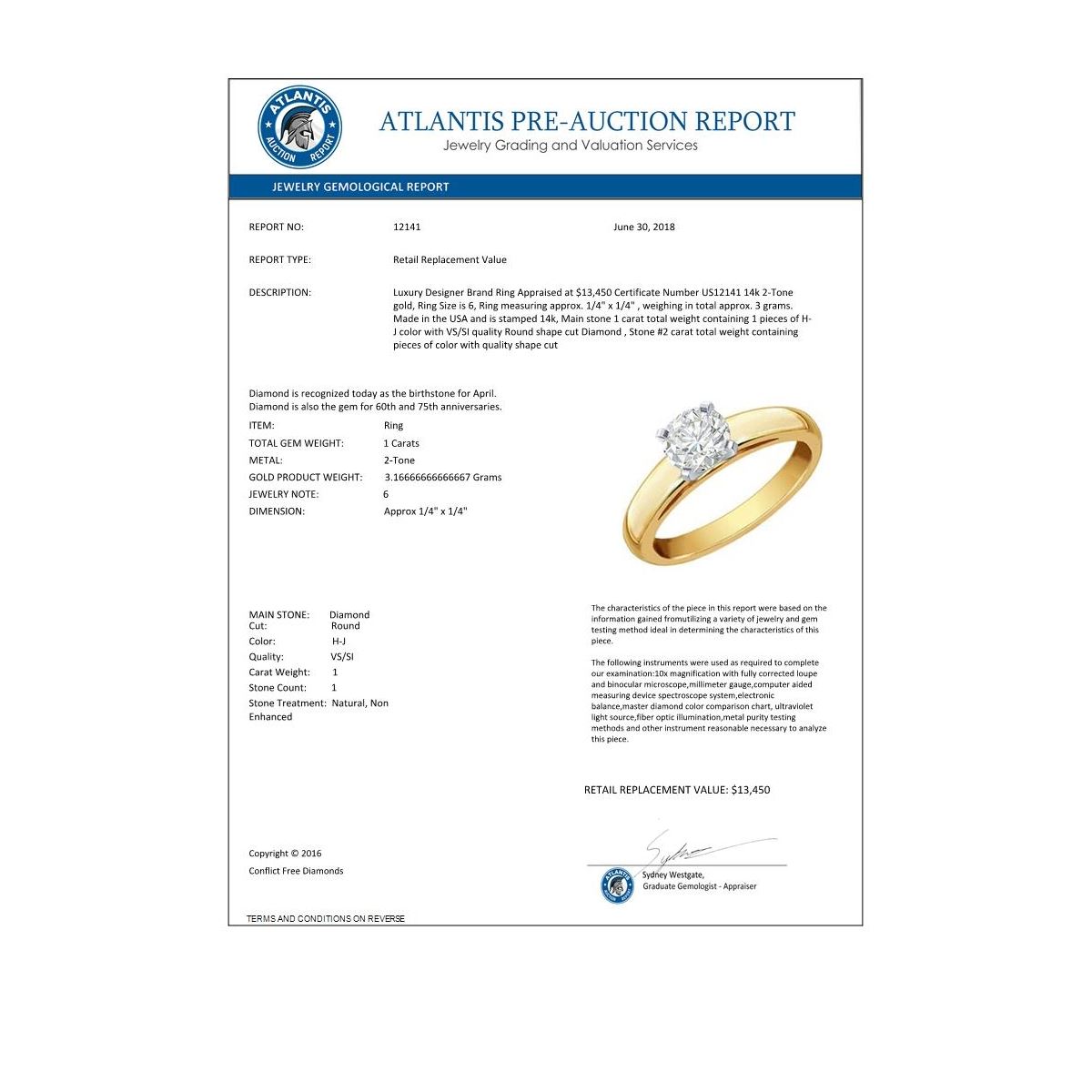 REF-287F8N -12141 ---- 1.0 CTW Certified VS/SI Diamond Solitaire Ring 14K 2-Tone Gold ---- Luxury Designer Brand Ring Appraised at $13,450 Certificate Number US12141 14k 2-Tone gold, Ring Size is 6, Ring measuring approx. 1/4" x 1/4" , weighing in total approx. 3 grams. Made in the USA and is stamped 14k, Main stone 1 carat total weight containing 1 pieces of H-J color with VS/SI quality Round shape cut Diamond , Stone #2 carat total weight containing pieces of color with quality shape cut