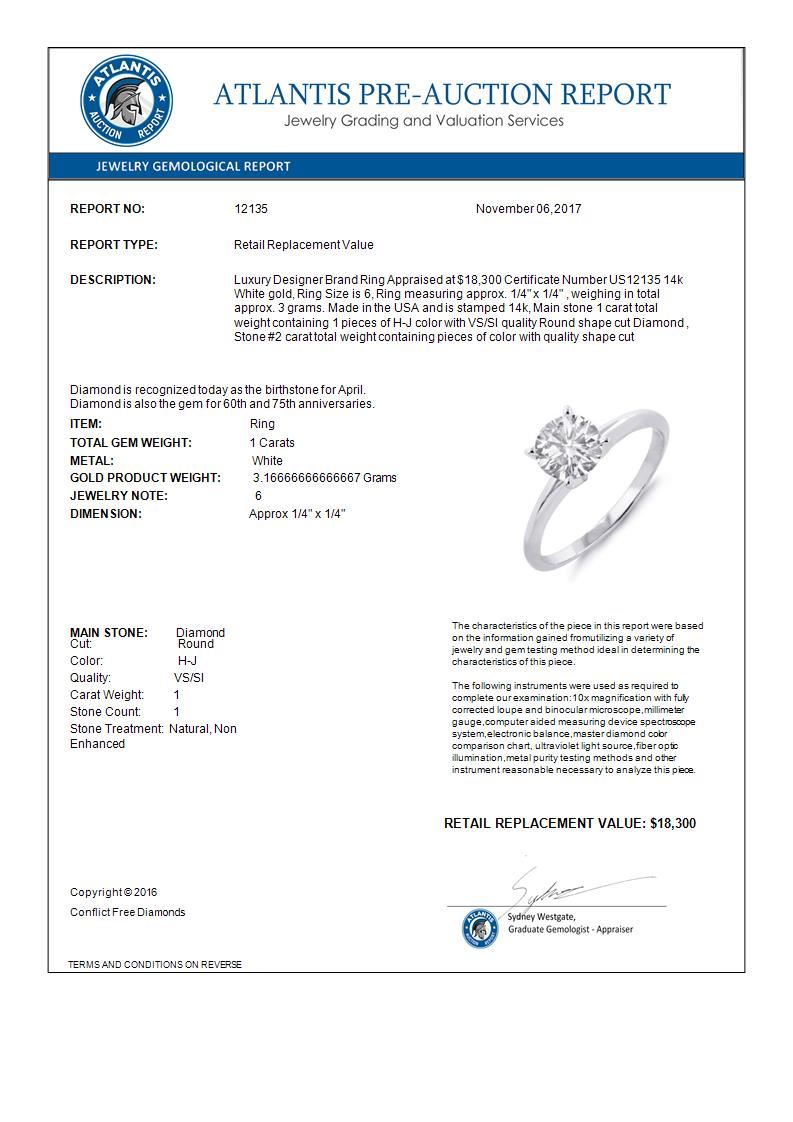 REF-391W9F -12135 ---- 1.0 CTW Certified VS/SI Diamond Solitaire Ring 14K White Gold ---- Luxury Designer Brand Ring Appraised at $18,300 Certificate Number US12135 14k White gold, Ring Size is 6, Ring measuring approx. 1/4" x 1/4" , weighing in total approx. 3 grams. Made in the USA and is stamped 14k, Main stone 1 carat total weight containing 1 pieces of H-J color with VS/SI quality Round shape cut Diamond , Stone #2 carat total weight containing pieces of color with quality shape cut