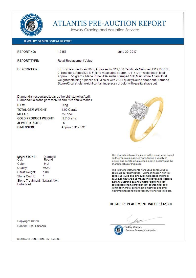 1.0 CTW Certified VS/SI Diamond Solitaire Ring 18K 2-Tone Gold ---- Luxury Designer Brand Ring Appraised Retail Price at $12,300 ---- SKU Number US12158 18k 2-Tone gold Ring Size is 6, Ring measuring approx. 1/4" x 1/4" , weighing in total approx. 3.51 grams. Made in the USA and is stamped 18k, Main stone 1.00 carat total weight containing 1 pieces of H-J color with VS/SI quality Round shape cut Diamond , Stone #2 carat total weight containing pieces of color with quality shape cut