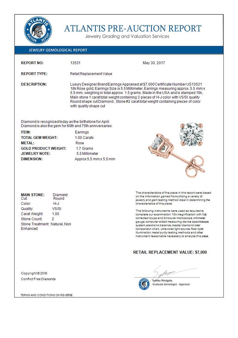 1.0 CTW Certified VS/SI Diamond Solitaire Stud Earrings 18K Rose Gold ---- Luxury Designer Brand Earrings Appraised Retail Price at $7,000 ---- SKU Number US13531 18k Rose gold Earrings Size is 5.5 Millimeter, Earrings measuring approx. 5.5 mm x 5.5 mm, weighing in total approx. 1.5 grams. Made in the USA and is stamped 18k, Main stone 1.00 carat total weight containing 2 pieces of H-J color with VS/SI quality Round shape cut Diamond , Stone #2 carat total weight containing pieces of color with quality shape cut
