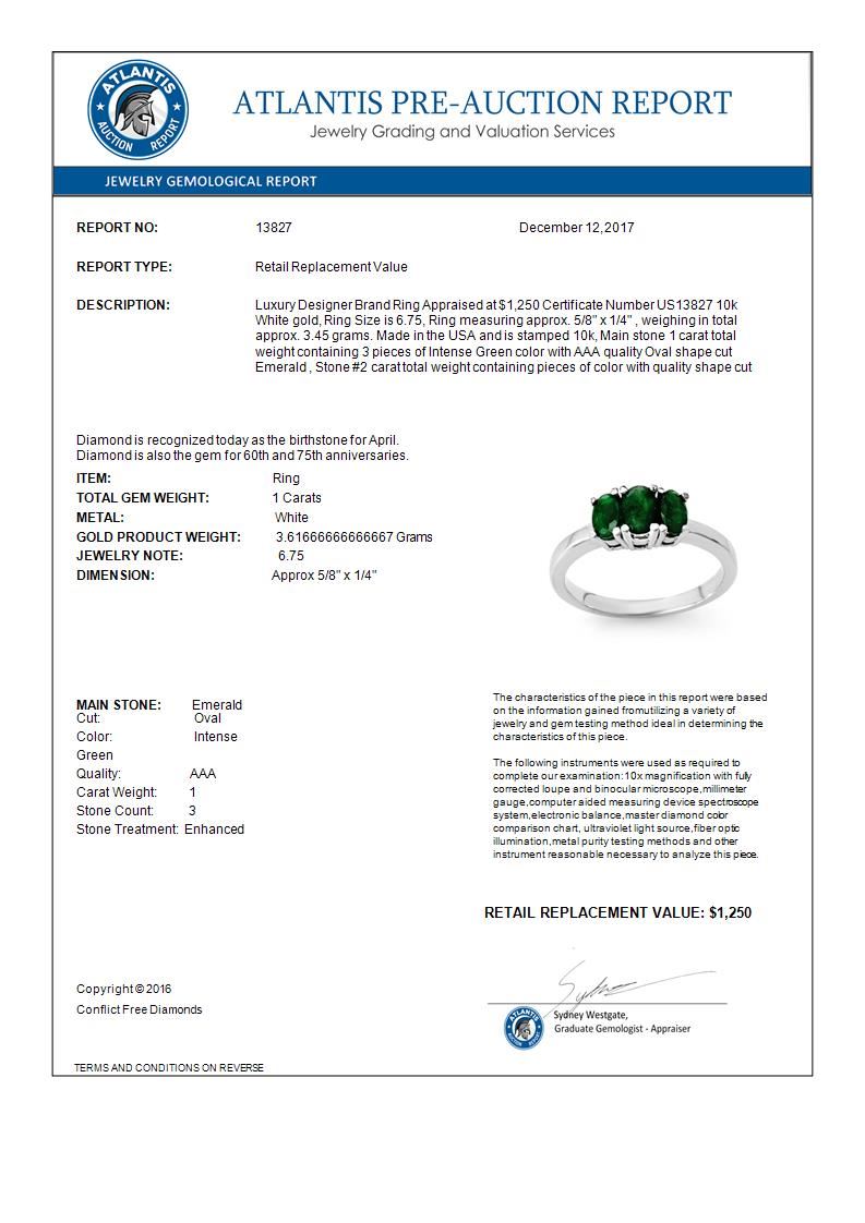 REF-19H3A -13827 ---- 1.0 CTW Emerald Ring 10K White Gold ---- Luxury Designer Brand Ring Appraised at $1,250 Certificate Number US13827  10k White gold,  Ring Size is 6.75, Ring measuring approx. 5/8" x  1/4" , weighing in total approx. 3.45 grams. Made in the USA and is stamped 10k, Main stone 1 carat total weight containing 3 pieces of Intense Green color with AAA quality Oval shape cut Emerald , Stone #2  carat total weight containing  pieces of  color with quality  shape cut