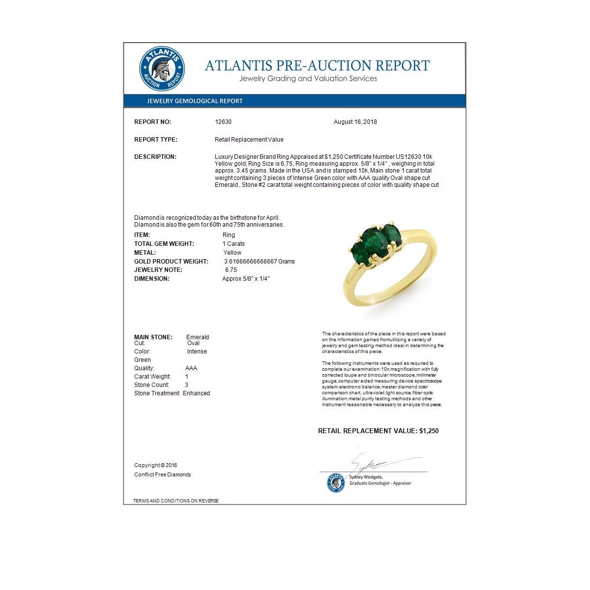 REF-19T3M -12630 ---- 1.0 CTW Emerald Ring 10K Yellow Gold ---- Luxury Designer Brand Ring Appraised at $1,250 Certificate Number US12630 10k Yellow gold, Ring Size is 6.75, Ring measuring approx. 5/8" x 1/4" , weighing in total approx. 3.45 grams. Made in the USA and is stamped 10k, Main stone 1 carat total weight containing 3 pieces of Intense Green color with AAA quality Oval shape cut Emerald , Stone #2 carat total weight containing pieces of color with quality shape cut