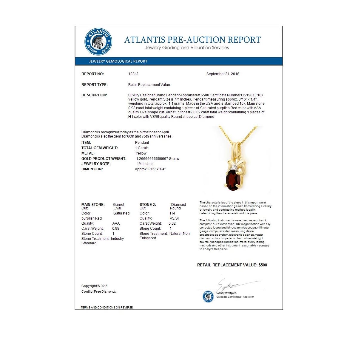 REF-9N3Y -12813 ---- 1.0 CTW Garnet & Diamond Pendant 10K Yellow Gold ---- Luxury Designer Brand Pendant Appraised at $500 Certificate Number US12813 10k Yellow gold, Pendant Size is 1/4 Inches, Pendant measuring approx. 3/16" x 1/4", weighing in total approx. 1.1 grams. Made in the USA and is stamped 10k, Main stone 0.98 carat total weight containing 1 pieces of Saturated purplish Red color with AAA quality Oval shape cut Garnet , Stone #2 0.02 carat total weight containing 1 pieces of H-I color with VS/SI quality Round shape cut Diamond