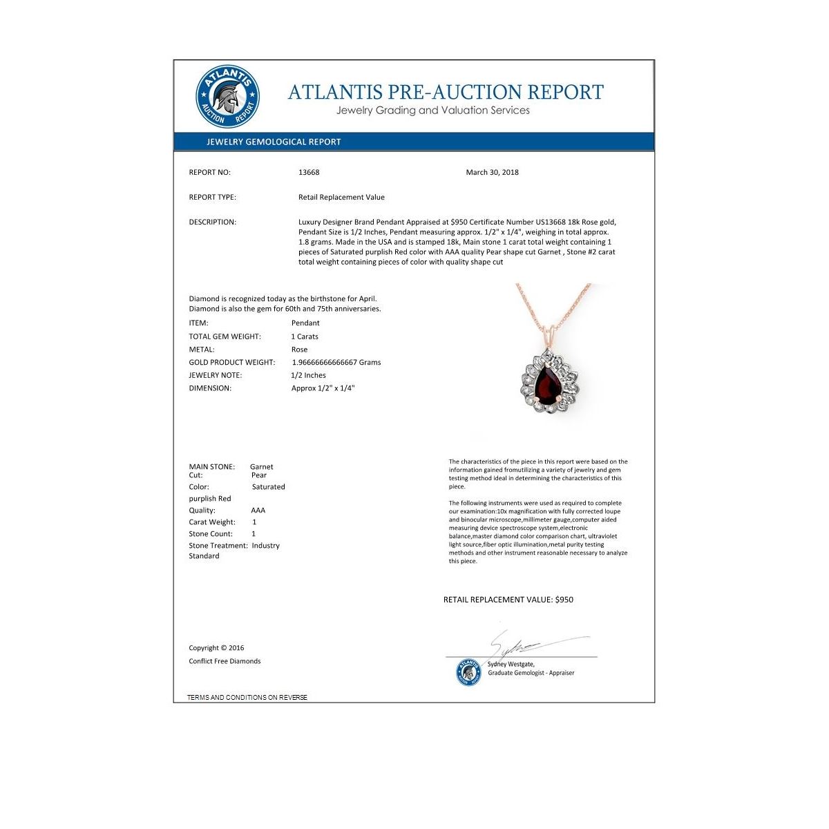 REF-15K6W -13668 ---- 1.0 CTW Garnet Pendant 18K Rose Gold ---- Luxury Designer Brand Pendant Appraised at $950 Certificate Number US13668 18k Rose gold, Pendant Size is 1/2 Inches, Pendant measuring approx. 1/2" x 1/4", weighing in total approx. 1.8 grams. Made in the USA and is stamped 18k, Main stone 1 carat total weight containing 1 pieces of Saturated purplish Red color with AAA quality Pear shape cut Garnet , Stone #2 carat total weight containing pieces of color with quality shape cut