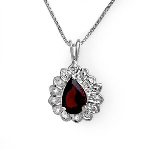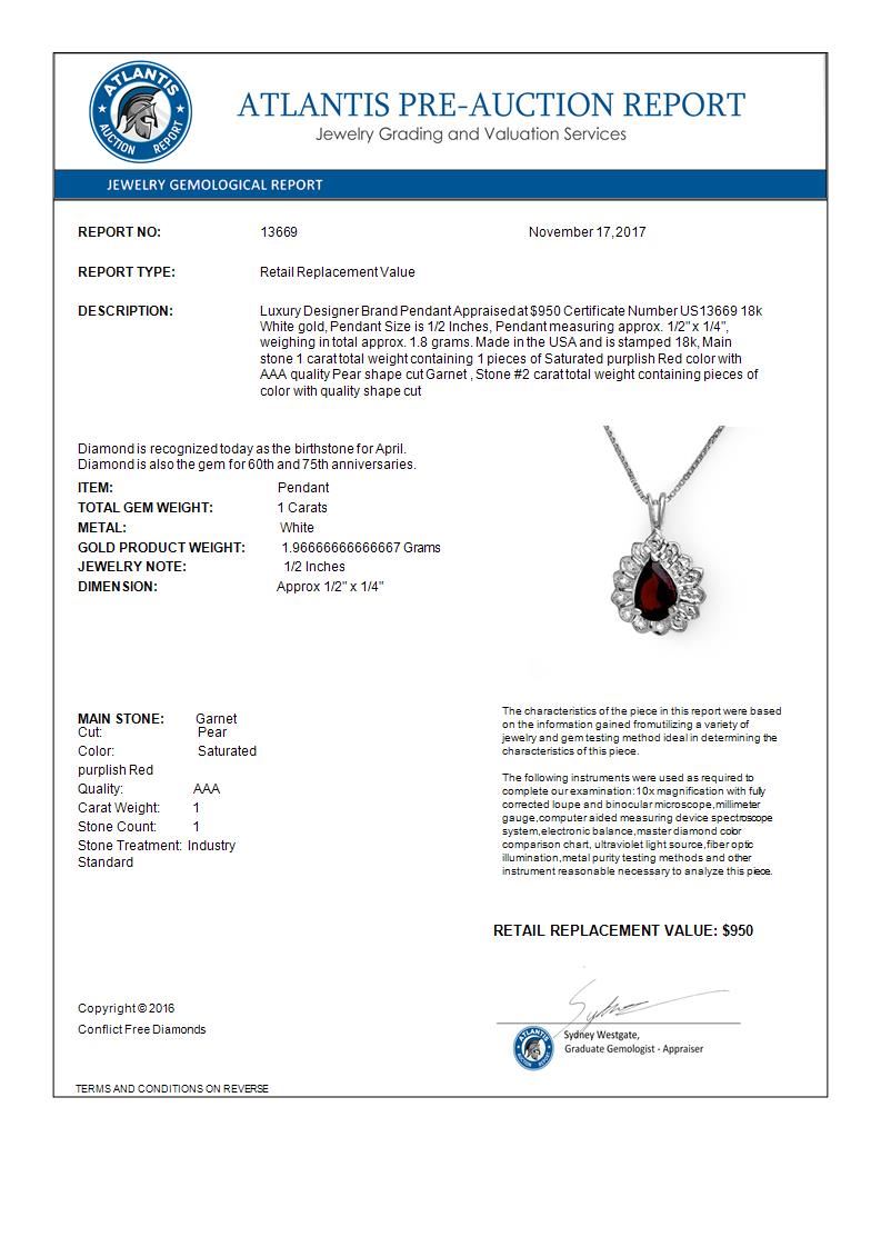 REF-15X6T -13669 ---- 1.0 CTW Garnet Pendant 18K White Gold ---- Luxury Designer Brand Pendant Appraised at $950 Certificate Number US13669 18k White gold, Pendant Size is 1/2 Inches, Pendant measuring approx. 1/2" x 1/4", weighing in total approx. 1.8 grams. Made in the USA and is stamped 18k, Main stone 1 carat total weight containing 1 pieces of Saturated purplish Red color with AAA quality Pear shape cut Garnet , Stone #2 carat total weight containing pieces of color with quality shape cut