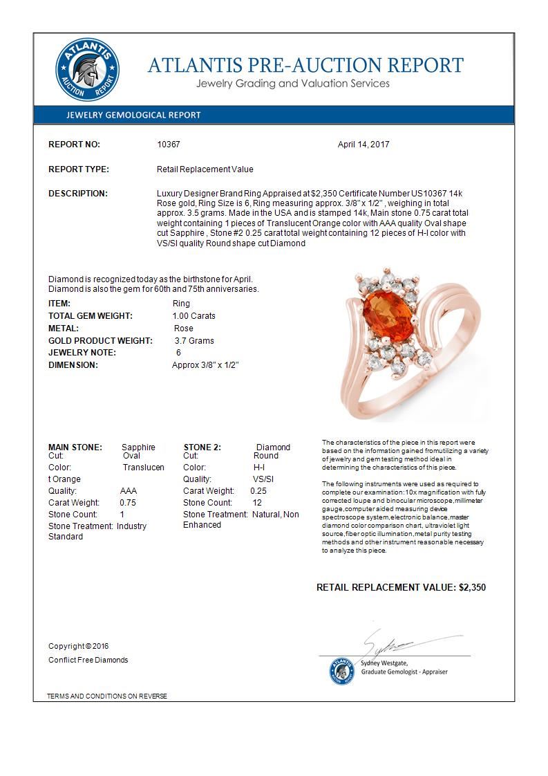 1.0 CTW Orange Sapphire & Diamond Ring 14K Rose Gold ---- Luxury Designer Brand Ring Appraised Retail Price at $2,350 ---- SKU Number US10367 14k Rose gold Ring Size is 6, Ring measuring approx. 3/8" x 1/2" , weighing in total approx. 3.5 grams. Made in the USA and is stamped 14k, Main stone 0.75 carat total weight containing 1 pieces of Translucent Orange color with AAA quality Oval shape cut Sapphire , Stone #2 0.25 carat total weight containing 12 pieces of H-I color with VS/SI quality Round shape cut