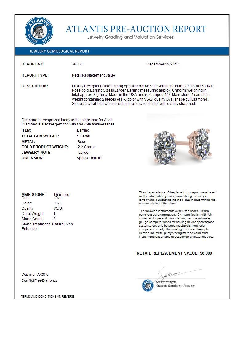 REF-148Y5K -38358 ---- 1.0 CTW Oval Cut VS/SI Diamond Stud Designer Earrings 14K Rose Gold ---- Luxury Designer Brand Earring Appraised at $8,900 Certificate Number US38358 14k Rose gold, Earring Size is Larger, Earring measuring approx. Uniform, weighing in total approx. 2 grams. Made in the USA and is stamped 14k, Main stone 1 carat total weight containing 2 pieces of H-J color with VS/SI quality Oval shape cut Diamond , Stone #2 carat total weight containing pieces of color with quality shape cut