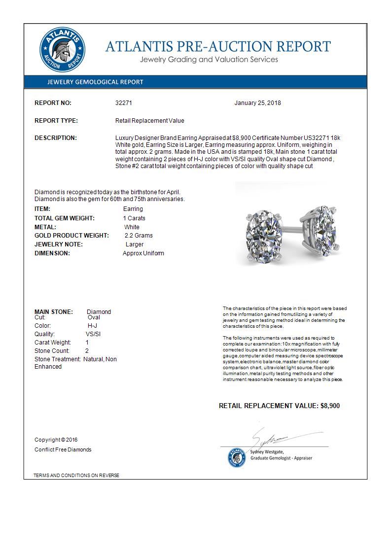 REF-180W2F -32271 ---- 1.0 CTW Oval Cut VS/SI Diamond Stud Designer Earrings 18K White Gold ---- Luxury Designer Brand Earring Appraised at $8,900 Certificate Number US32271 18k White gold, Earring Size is Larger, Earring measuring approx. Uniform, weighing in total approx. 2 grams. Made in the USA and is stamped 18k, Main stone 1 carat total weight containing 2 pieces of H-J color with VS/SI quality Oval shape cut Diamond , Stone #2 carat total weight containing pieces of color with quality shape cut