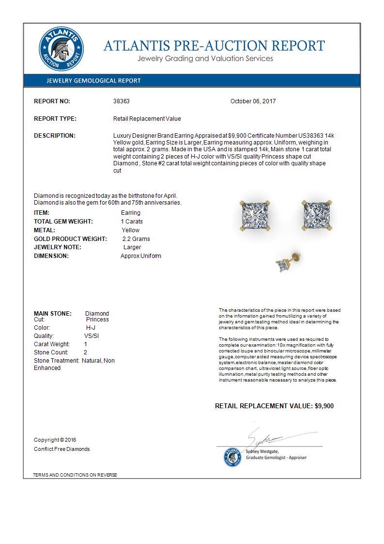38363 - REF-148V5Y ---- 1.0 CTW Princess Cut VS/SI Diamond Stud Designer Earrings 14K Yellow Gold ---- Luxury Designer Brand Earring Appraised at $9,900 Certificate Number US38363 14k Yellow gold, Earring Size is Larger, Earring measuring approx. Uniform, weighing in total approx. 2 grams. Made in the USA and is stamped 14k, Main stone 1 carat total weight containing 2 pieces of H-J color with VS/SI quality Princess shape cut Diamond , Stone #2 carat total weight containing pieces of color with quality shape cut
