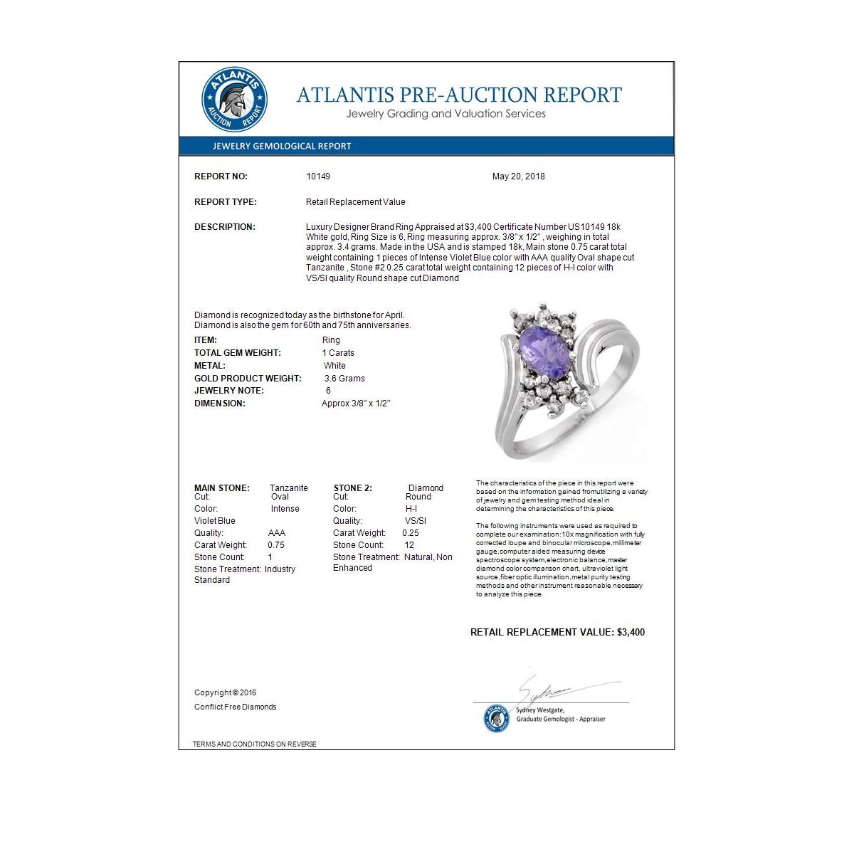 REF-47X3T -10149 ---- 1.0 CTW Tanzanite & Diamond Ring 18K White Gold ---- Luxury Designer Brand Ring Appraised at $3,400 Certificate Number US10149 18k White gold, Ring Size is 6, Ring measuring approx. 3/8" x 1/2" , weighing in total approx. 3.4 grams. Made in the USA and is stamped 18k, Main stone 0.75 carat total weight containing 1 pieces of Intense Violet Blue color with AAA quality Oval shape cut Tanzanite , Stone #2 0.25 carat total weight containing 12 pieces of H-I color with VS/SI quality Round shape cut Diamond
