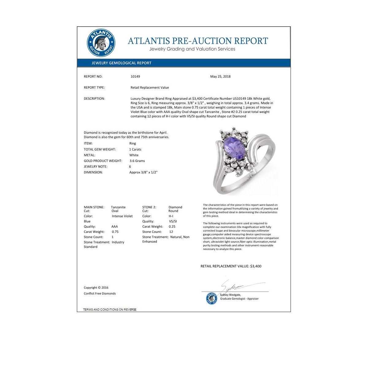 REF-47X3T -10149 ---- 1.0 CTW Tanzanite & Diamond Ring 18K White Gold ---- Luxury Designer Brand Ring Appraised at $3,400 Certificate Number US10149 18k White gold, Ring Size is 6, Ring measuring approx. 3/8" x 1/2" , weighing in total approx. 3.4 grams. Made in the USA and is stamped 18k, Main stone 0.75 carat total weight containing 1 pieces of Intense Violet Blue color with AAA quality Oval shape cut Tanzanite , Stone #2 0.25 carat total weight containing 12 pieces of H-I color with VS/SI quality Round shape cut Diamond