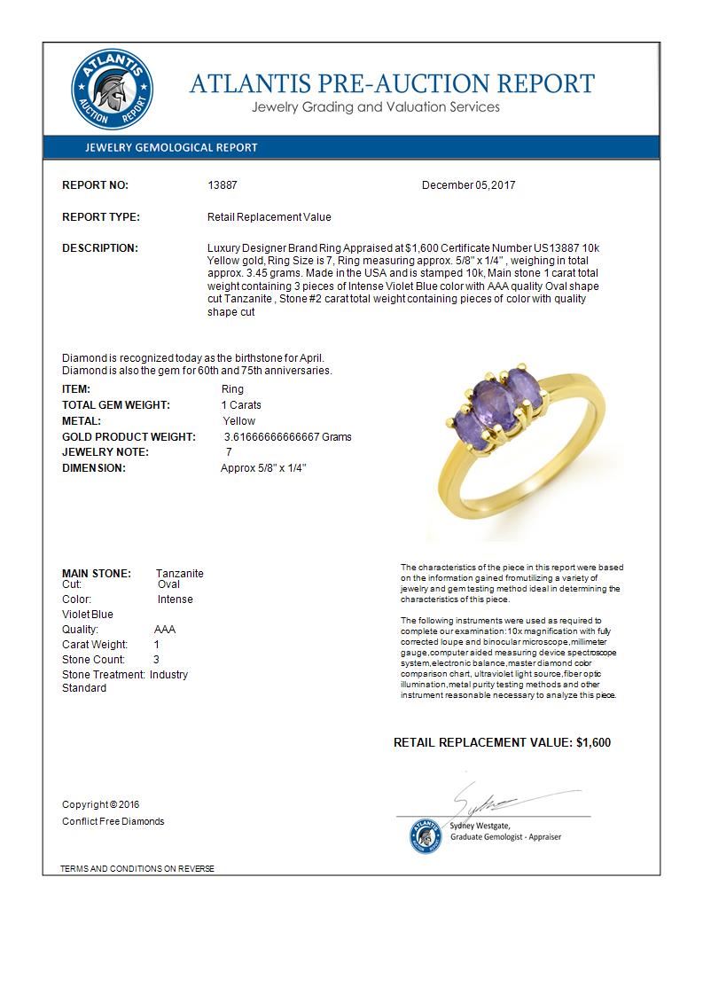 REF-22W2F -13887 ---- 1.0 CTW Tanzanite Ring 10K Yellow Gold ---- Luxury Designer Brand Ring Appraised at $1,600 Certificate Number US13887 10k Yellow gold, Ring Size is 7, Ring measuring approx. 5/8" x 1/4" , weighing in total approx. 3.45 grams. Made in the USA and is stamped 10k, Main stone 1 carat total weight containing 3 pieces of Intense Violet Blue color with AAA quality Oval shape cut Tanzanite , Stone #2 carat total weight containing pieces of color with quality shape cut