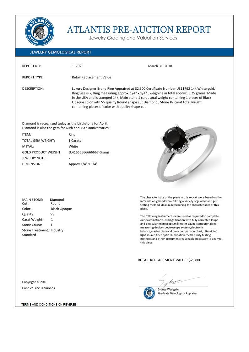 REF-41W8F -11792 ---- 1.0 CTW VS Certified Black Diamond Solitaire Ring 14K White Gold ---- Luxury Designer Brand Ring Appraised at $2,300 Certificate Number US11792 14k White gold, Ring Size is 7, Ring measuring approx. 1/4" x 1/4" , weighing in total approx. 3.25 grams. Made in the USA and is stamped 14k, Main stone 1 carat total weight containing 1 pieces of Black Opaque color with VS quality Round shape cut Diamond , Stone #2 carat total weight containing pieces of color with quality shape cut