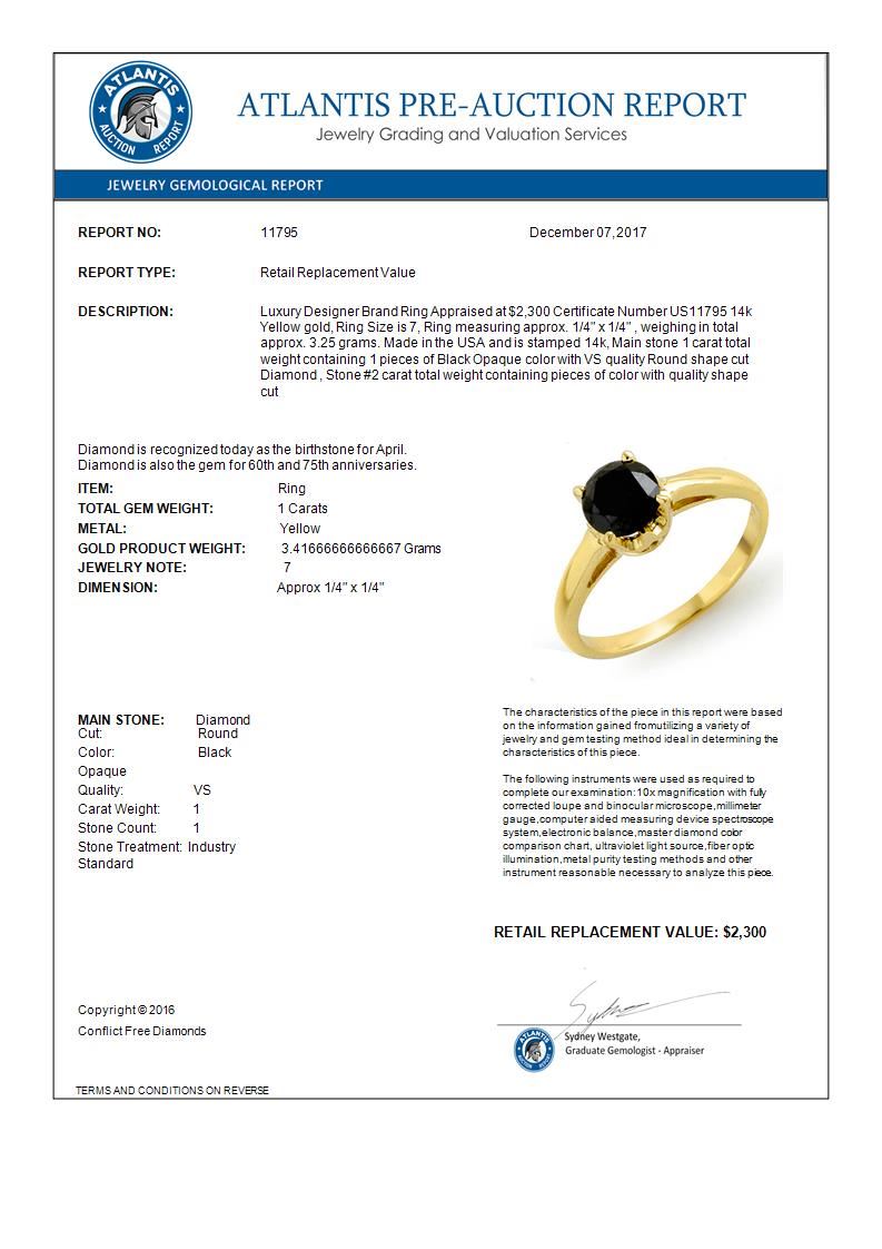 REF-41T8M -11795 ---- 1.0 CTW VS Certified Black Diamond Solitaire Ring 14K Yellow Gold ---- Luxury Designer Brand Ring Appraised at $2,300 Certificate Number US11795 14k Yellow gold, Ring Size is 7, Ring measuring approx. 1/4" x 1/4" , weighing in total approx. 3.25 grams. Made in the USA and is stamped 14k, Main stone 1 carat total weight containing 1 pieces of Black Opaque color with VS quality Round shape cut Diamond , Stone #2 carat total weight containing pieces of color with quality shape cut
