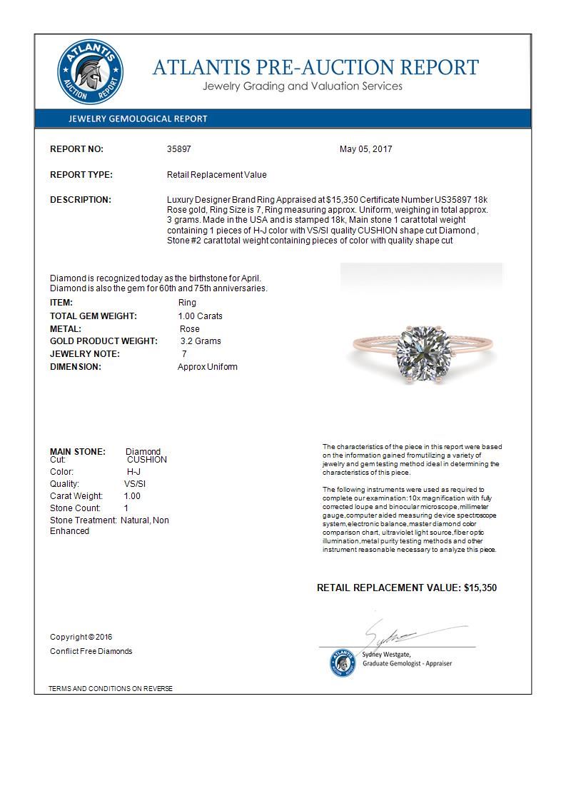 1.0 CTW VS/SI Cushion Diamond Solitaire Engagement Ring 18K Rose Gold ---- Luxury Designer Brand Ring Appraised Retail Price at $15,350 ---- SKU Number US35897 18k Rose gold Ring Size is 7, Ring measuring approx. Uniform, weighing in total approx. 3 grams. Made in the USA and is stamped 18k, Main stone 1.00 carat total weight containing 1 pieces of H-J color with VS/SI quality CUSHION shape cut Diamond , Stone #2 carat total weight containing pieces of color with quality shape cut