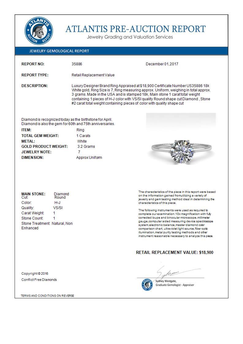 35886 - REF-283N5A ---- 1.0 CTW VS/SI Diamond Solitaire Engagement Ring 18K White Gold ---- Luxury Designer Brand Ring Appraised at $18,900 Certificate Number US35886 18k White gold, Ring Size is 7, Ring measuring approx. Uniform, weighing in total approx. 3 grams. Made in the USA and is stamped 18k, Main stone 1 carat total weight containing 1 pieces of H-J color with VS/SI quality Round shape cut Diamond , Stone #2 carat total weight containing pieces of color with quality shape cut