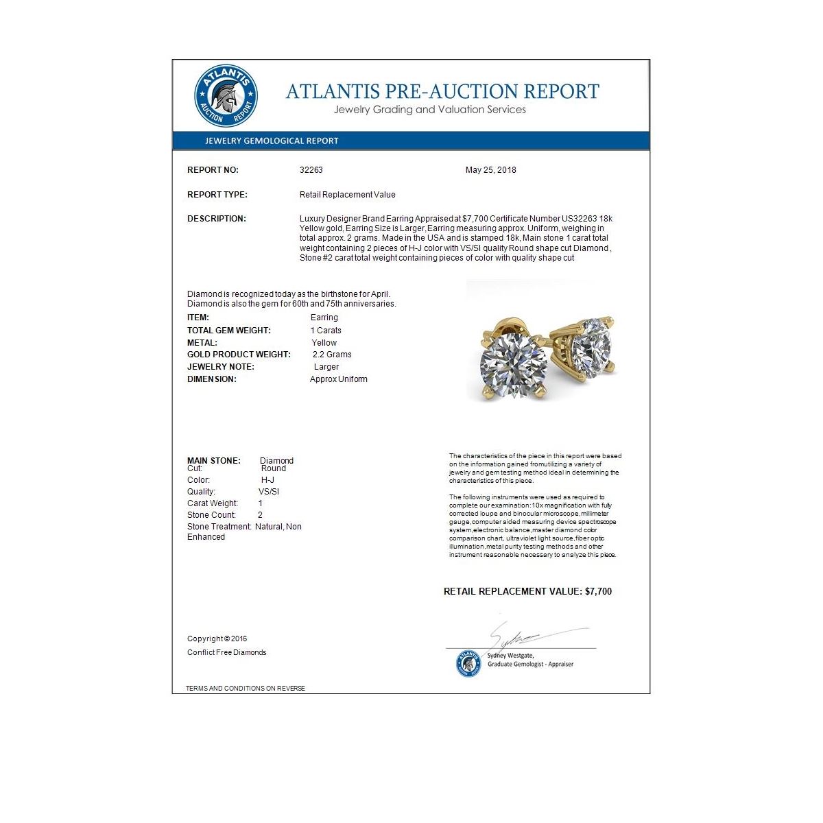REF-155Y3K -32263 ---- 1.0 CTW VS/SI Diamond Stud Designer Earrings 18K Yellow Gold ---- Luxury Designer Brand Earring Appraised at $7,700 Certificate Number US32263 18k Yellow gold, Earring Size is Larger, Earring measuring approx. Uniform, weighing in total approx. 2 grams. Made in the USA and is stamped 18k, Main stone 1 carat total weight containing 2 pieces of H-J color with VS/SI quality Round shape cut Diamond , Stone #2 carat total weight containing pieces of color with quality shape cut