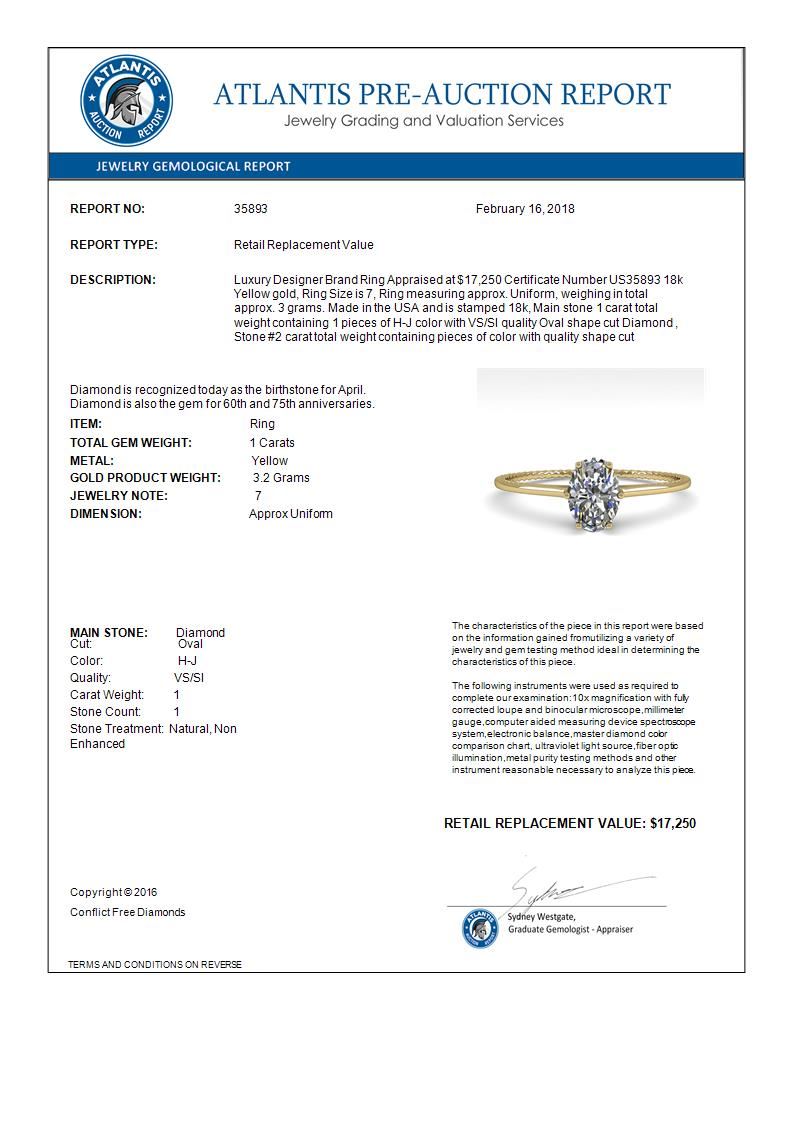 REF-287X4T -35893 ---- 1.0 CTW VS/SI Oval Cut Diamond Solitaire Engagement Ring Size 7 18K Yellow Gold ---- Luxury Designer Brand Ring Appraised at $17,250 Certificate Number US35893 18k Yellow gold, Ring Size is 7, Ring measuring approx. Uniform, weighing in total approx. 3 grams. Made in the USA and is stamped 18k, Main stone 1 carat total weight containing 1 pieces of H-J color with VS/SI quality Oval shape cut Diamond , Stone #2 carat total weight containing pieces of color with quality shape cut