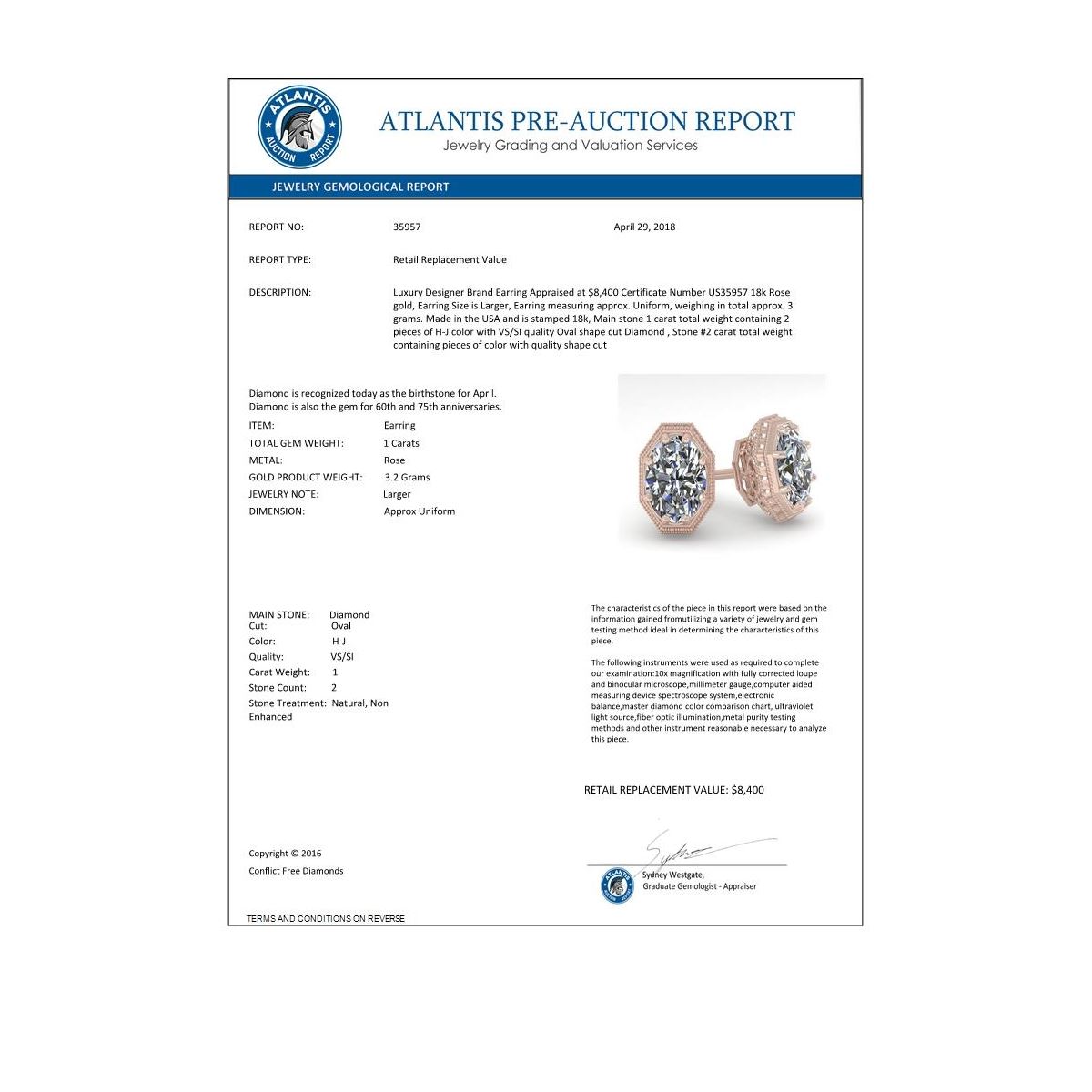 REF-169N3Y -35957 ---- 1.0 CTW VS/SI Oval Cut Diamond Stud Solitaire Earrings 18K Rose Gold ---- Luxury Designer Brand Earring Appraised at $8,400 Certificate Number US35957 18k Rose gold, Earring Size is Larger, Earring measuring approx. Uniform, weighing in total approx. 3 grams. Made in the USA and is stamped 18k, Main stone 1 carat total weight containing 2 pieces of H-J color with VS/SI quality Oval shape cut Diamond , Stone #2 carat total weight containing pieces of color with quality shape cut