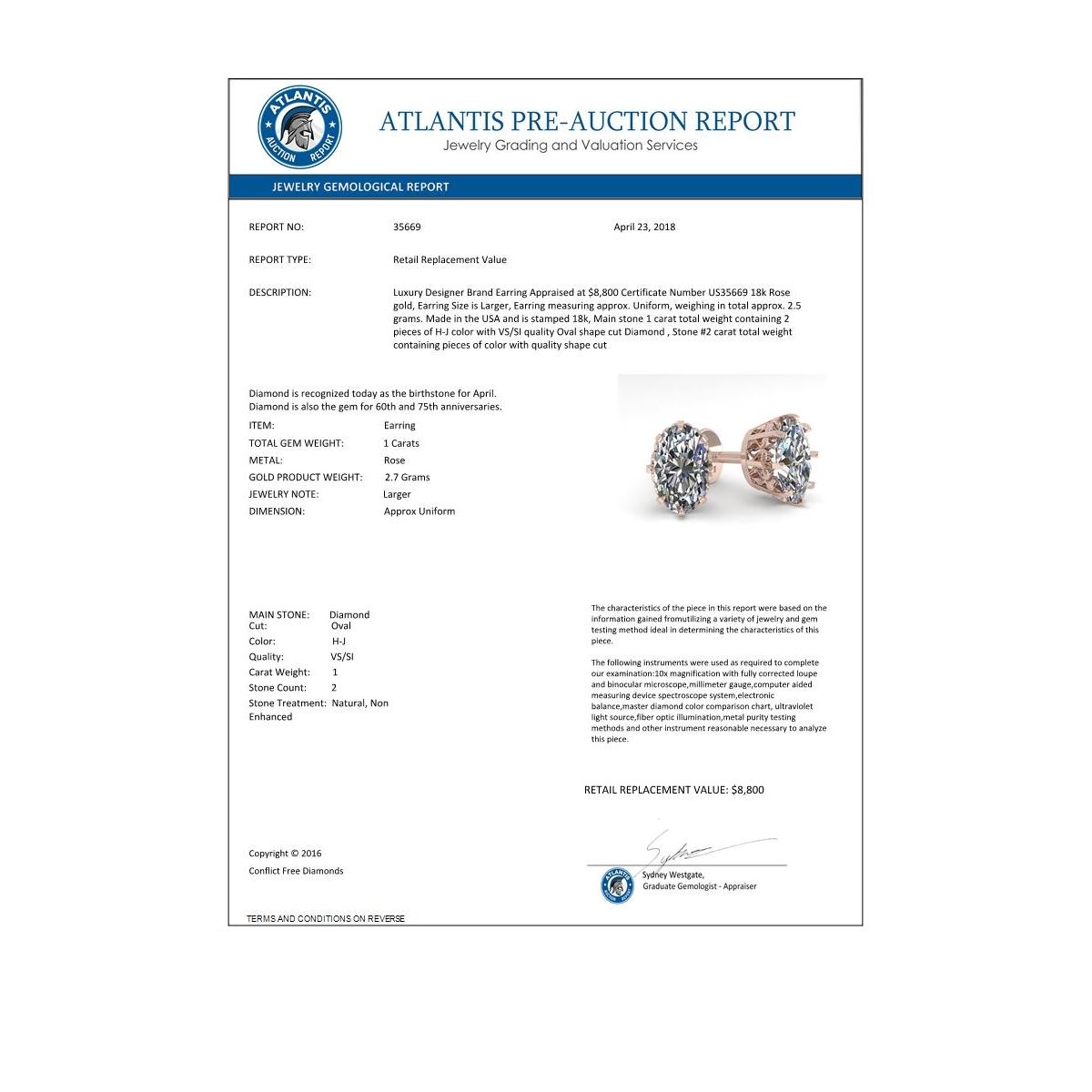 REF-178K2W -35669 ---- 1.0 CTW VS/SI Oval Cut Diamond Stud Solitaire Earrings 18K Rose Gold ---- Luxury Designer Brand Earring Appraised at $8,800 Certificate Number US35669 18k Rose gold, Earring Size is Larger, Earring measuring approx. Uniform, weighing in total approx. 2.5 grams. Made in the USA and is stamped 18k, Main stone 1 carat total weight containing 2 pieces of H-J color with VS/SI quality Oval shape cut Diamond , Stone #2 carat total weight containing pieces of color with quality shape cut