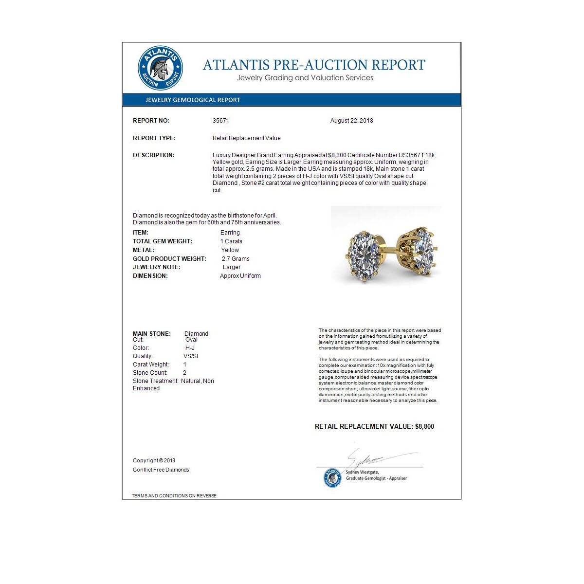 REF-178N2Y -35671 ---- 1.0 CTW VS/SI Oval Cut Diamond Stud Solitaire Earrings 18K Yellow Gold ---- Luxury Designer Brand Earring Appraised at $8,800 Certificate Number US35671 18k Yellow gold, Earring Size is Larger, Earring measuring approx. Uniform, weighing in total approx. 2.5 grams. Made in the USA and is stamped 18k, Main stone 1 carat total weight containing 2 pieces of H-J color with VS/SI quality Oval shape cut Diamond , Stone #2 carat total weight containing pieces of color with quality shape cut