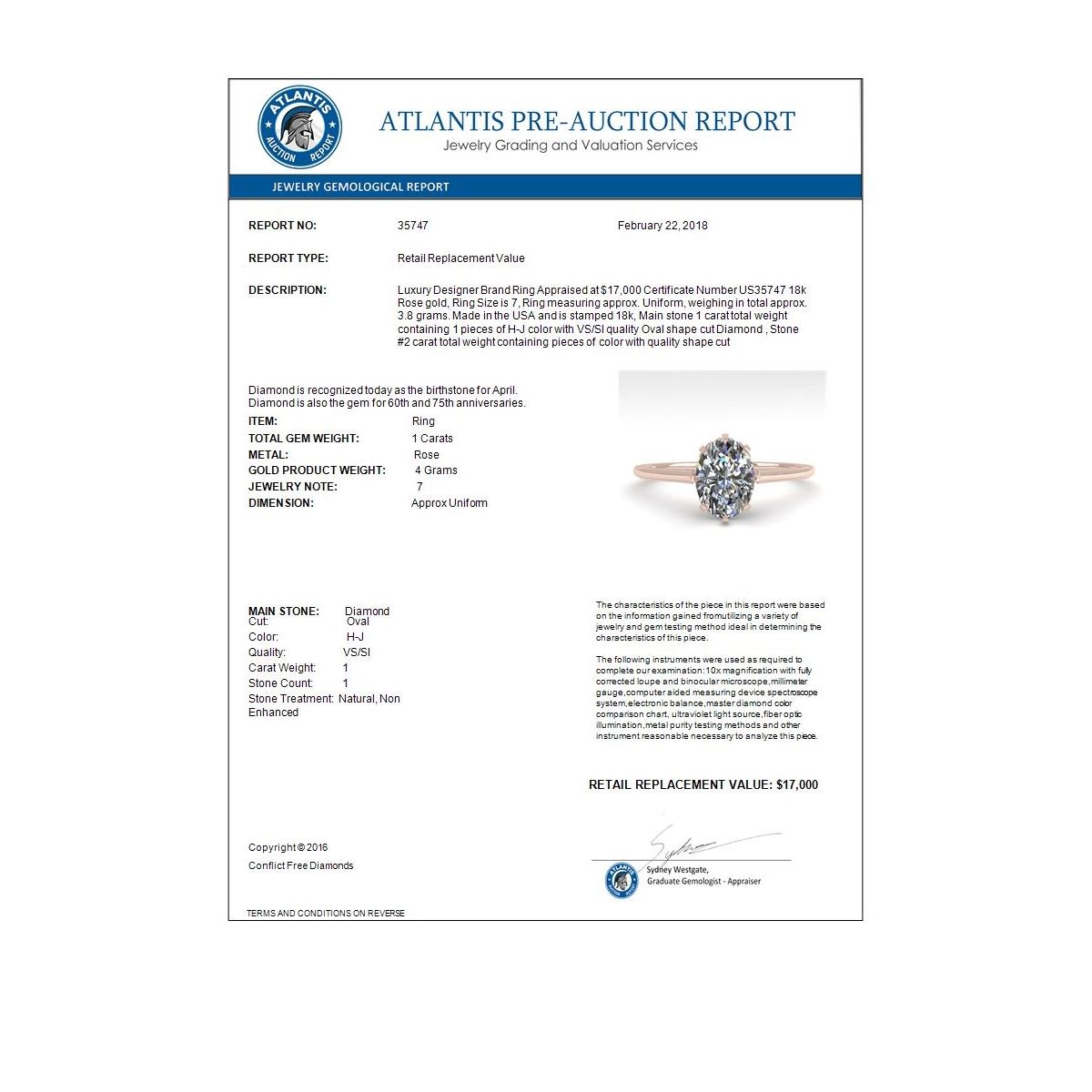 REF-283N5Y -35747 ---- 1.0 CTW VS/SI Oval Diamond Solitaire Engagement Ring 18K Rose Gold ---- Luxury Designer Brand Ring Appraised at $17,000 Certificate Number US35747 18k Rose gold, Ring Size is 7, Ring measuring approx. Uniform, weighing in total approx. 3.8 grams. Made in the USA and is stamped 18k, Main stone 1 carat total weight containing 1 pieces of H-J color with VS/SI quality Oval shape cut Diamond , Stone #2 carat total weight containing pieces of color with quality shape cut