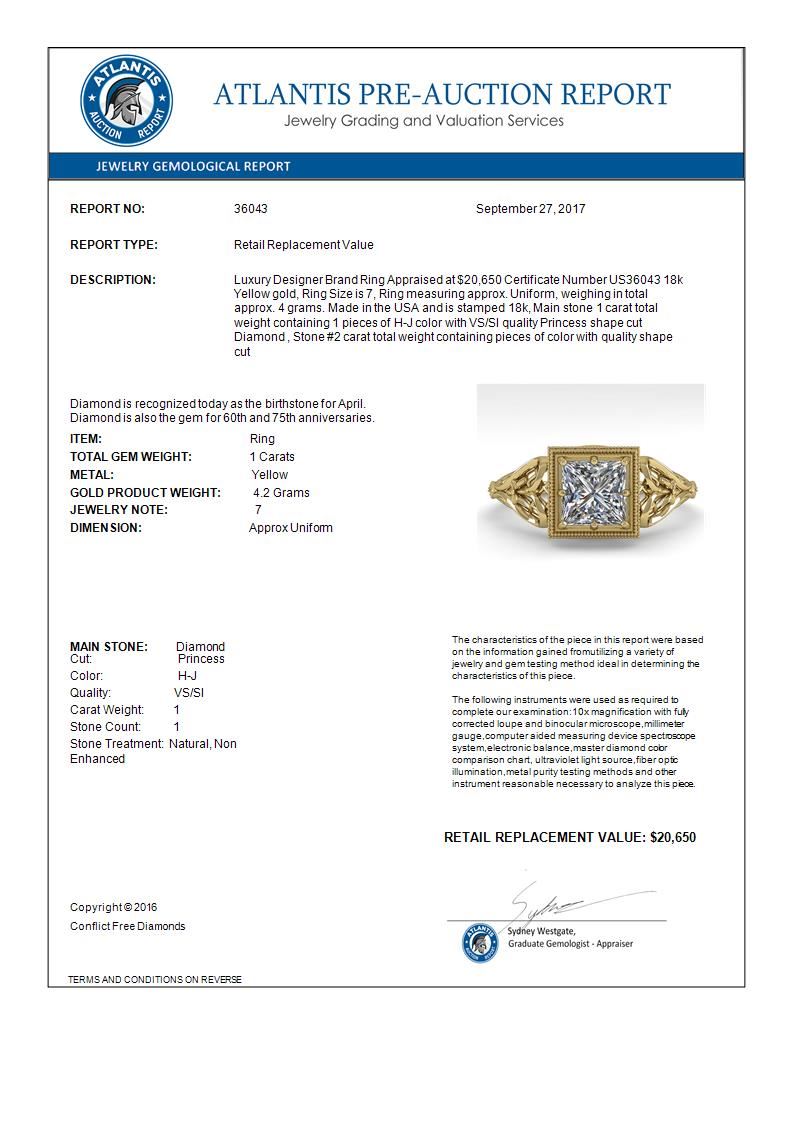 36043 - REF-344Y4X ---- 1.0 CTW VS/SI Princess Diamond Solitaire Engagement Ring Deco 18K Yellow Gold ---- Luxury Designer Brand Ring Appraised at $20,650 Certificate Number US36043 18k Yellow gold, Ring Size is 7, Ring measuring approx. Uniform, weighing in total approx. 4 grams. Made in the USA and is stamped 18k, Main stone 1 carat total weight containing 1 pieces of H-J color with VS/SI quality Princess shape cut Diamond , Stone #2 carat total weight containing pieces of color with quality shape cut