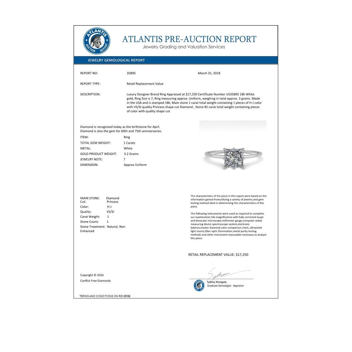REF-287H4A -35895 ---- 1.0 CTW VS/SI Princess Diamond Solitaire Engagement Ring Size 7 18K White Gold ---- Luxury Designer Brand Ring Appraised at $17,250 Certificate Number US35895 18k White gold, Ring Size is 7, Ring measuring approx. Uniform, weighing in total approx. 3 grams. Made in the USA and is stamped 18k, Main stone 1 carat total weight containing 1 pieces of H-J color with VS/SI quality Princess shape cut Diamond , Stone #2 carat total weight containing pieces of color with quality shape cut