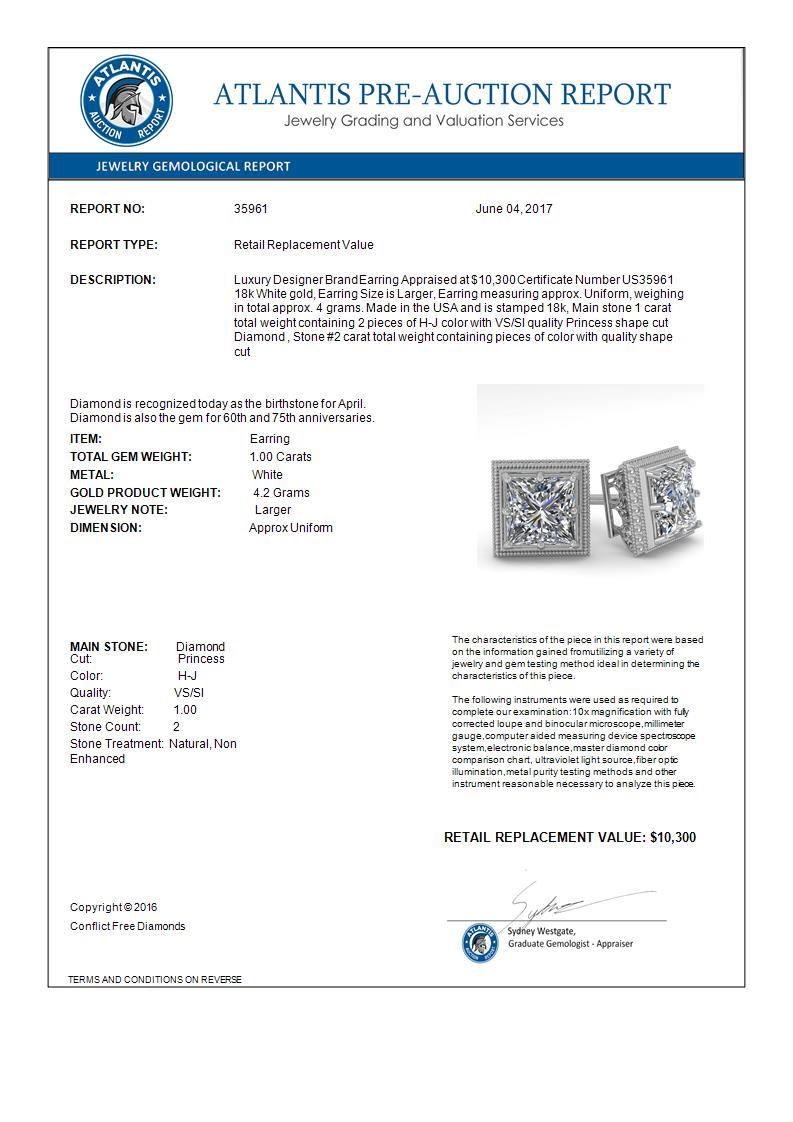 1.0 CTW VS/SI Princess Diamond Stud Solitaire Earrings 18K White Gold ---- Luxury Designer Brand Earring Appraised Retail Price at $10,300 ---- SKU Number US35961 18k White gold Earring Size is Larger, Earring measuring approx. Uniform, weighing in total approx. 4 grams. Made in the USA and is stamped 18k, Main stone 1.00 carat total weight containing 2 pieces of H-J color with VS/SI quality Princess shape cut Diamond , Stone #2 carat total weight containing pieces of color with quality shape cut