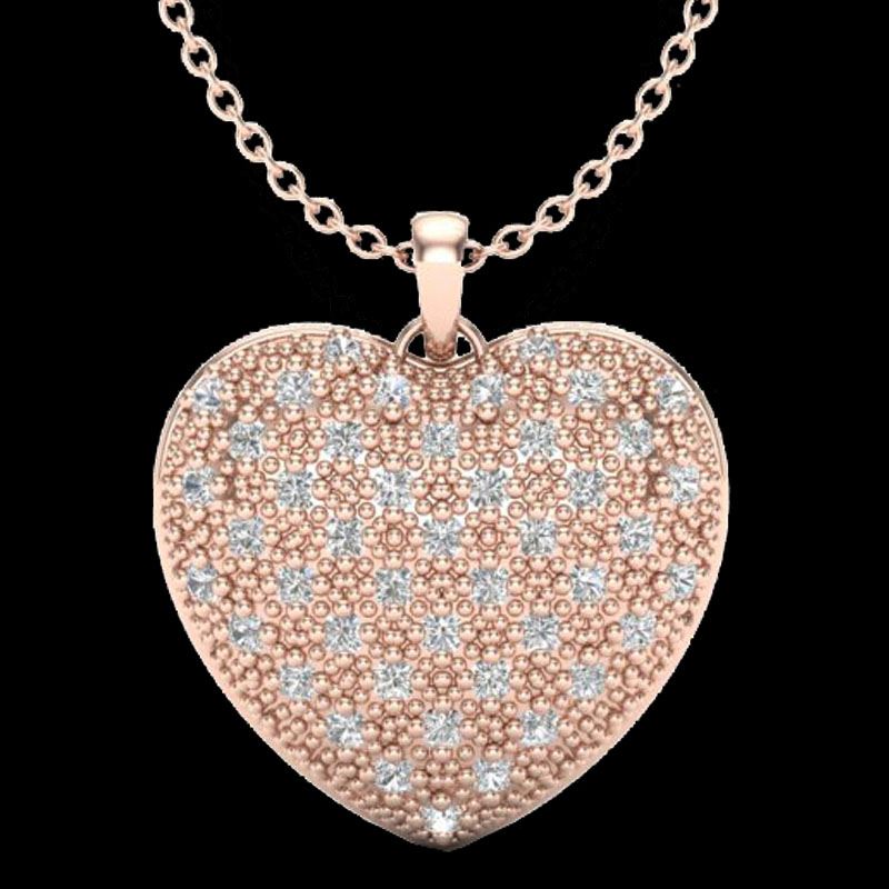 REF-87N3Y -20489 ---- 1.0 Designer CTW Micro Pave VS/SI Diamond Heart Necklace 14K Rose Gold ---- Luxury Designer Brand Necklace Appraised at $4,300 Certificate Number US20489 14k Rose gold, Necklace Size is 16 Inches, Necklace measuring approx. 5/8" x 5/8" , weighing in total approx. 5 grams. Made in the USA and is stamped 14k, Main stone 1 carat total weight containing 77 pieces of H-J color with VS/SI quality Round shape cut Diamond , Stone #2 carat total weight containing pieces of color with quality shape cut