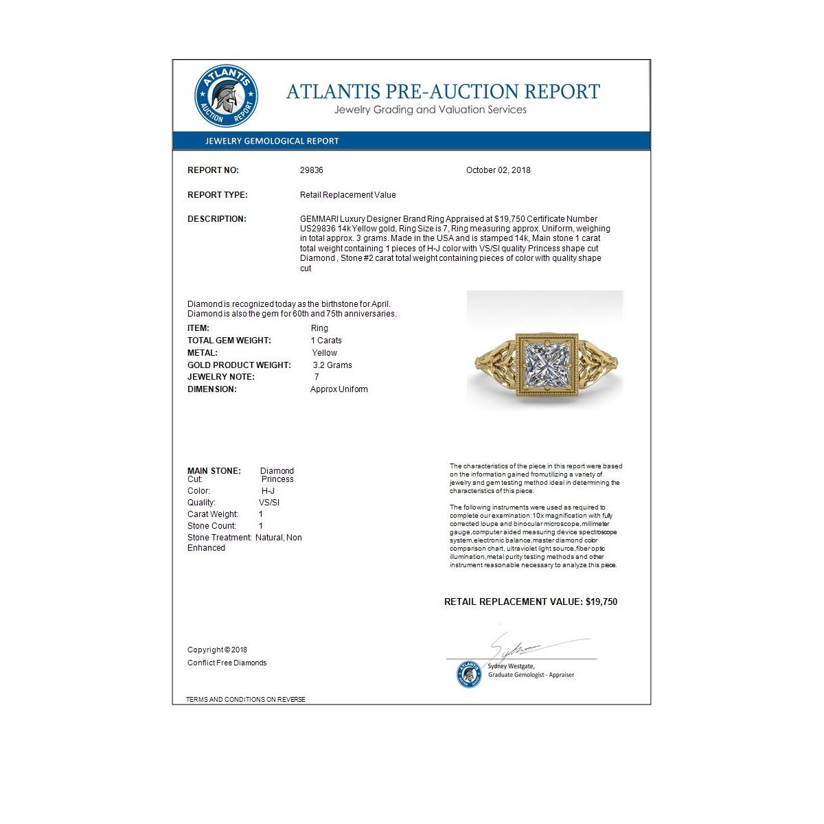 Bidders agree to pay a 19% buyer's premium added to the hammer price of the lot being auctioned. Condition reports and/or Gemological reports in Auction catalog are not guaranteed and may vary in accuracy. It is the responsibility of prospective bidders to inspect the goods. All reports, measurements, opinion of values, age and quality are offered by Oxford Auction but are not guaranteed. Neither the auction house, nor the consignor, is responsible for the accuracy of printed or verbal descriptions or its authenticity. All jewelry items sold by Oxford Auction are evaluated by third party appraisal firms where certified GIA gemologists evaluate the weight, size and grade of gemstone and/or metal to determine the replacement value of the item. Please be advised that all appraisals are done for insurance purposes only and do not determine the actual value of the jewelry on auction. The appraisals are done for the sole purpose of protecting the buyer in the event of damage or loss of purchased jewelry items from Oxford Auction. Oxford Auction is not responsible for the opinions and appraisals of any third party appraisal firms and their experts.