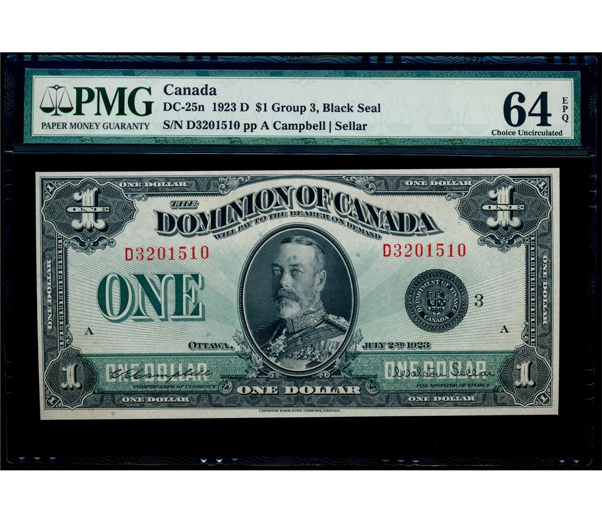 $1.00. July 2, 1923. DC-25n. Campbell-Sellar. Black seal, Group 3. Series 'D'. No.3201510/A. PMG graded Very Choice Uncirculated-64 EPQ.