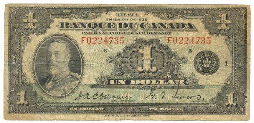 Bank of Canada; $1.00 1935 French note, BC-2, Choice VG/F, signature Osborne-Towers, serial # F0224735.