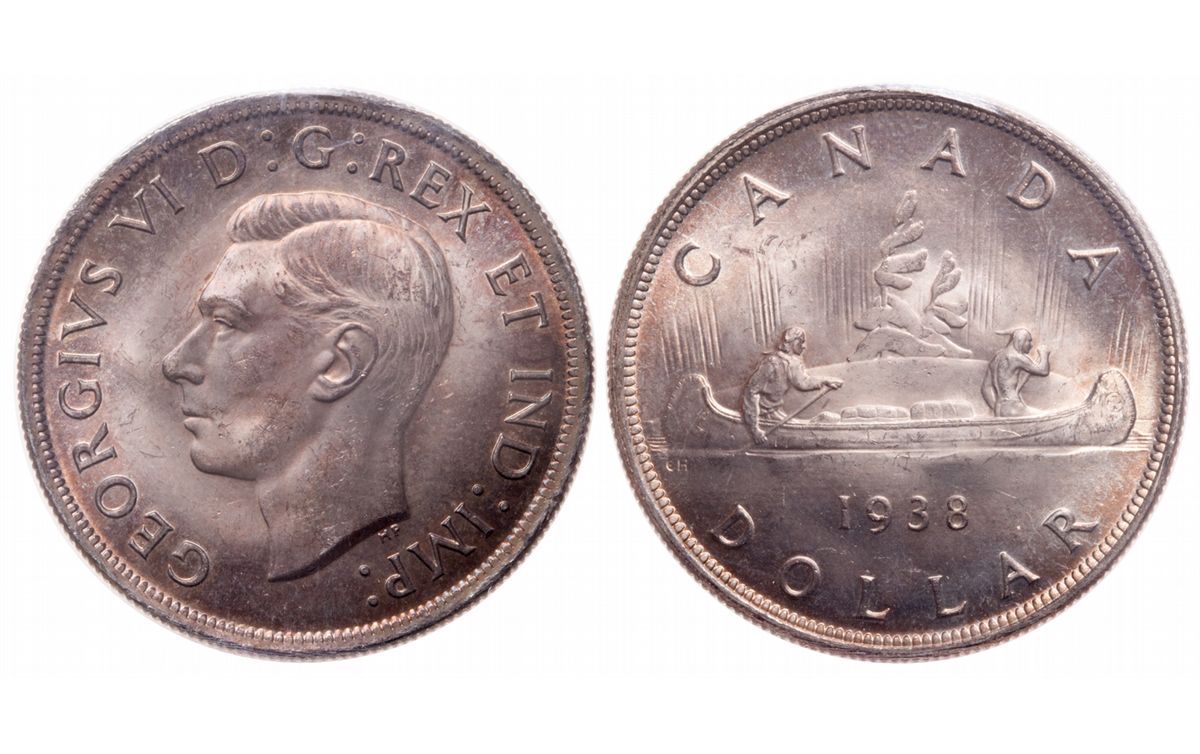 1 Dollar. 1938. ICCS graded Superb Gem Uncirculated-66. One of the key dates of the George VI silver dollars, with a scant mintage of only 90,304 pieces. This handsome coin is draped in translucent hues of deep bronze and mahogany, through which radiates the lovely shifting lustre. Few examples of the 1938 dollar have achieved a Gem attribution from ICCS, and only a trio have warranted a premium grade of MS-66. A rare opportunity to obtain such a census rarity.