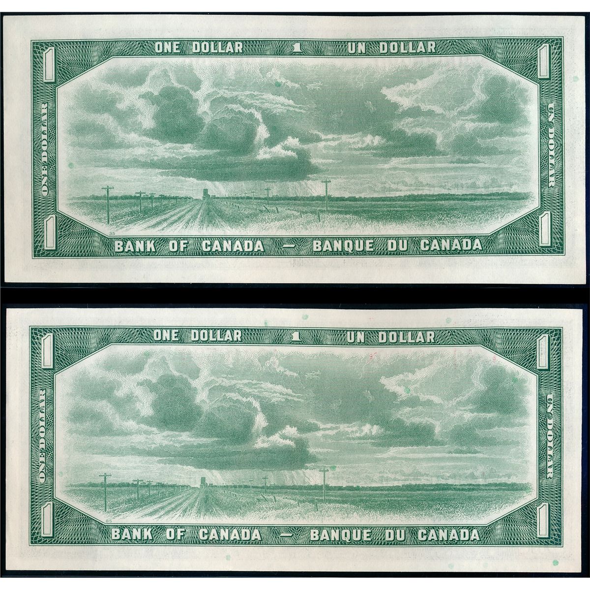 $1.00. 1954 Issue. BC-37aA. No. *A/A0035720. Beattie-Coyne. Unc; $1.00. 1954 Issue. BC-37bA. No. *A/A0218520. Beattie-Rasminsky. Unc. Lot of two (2) notes.